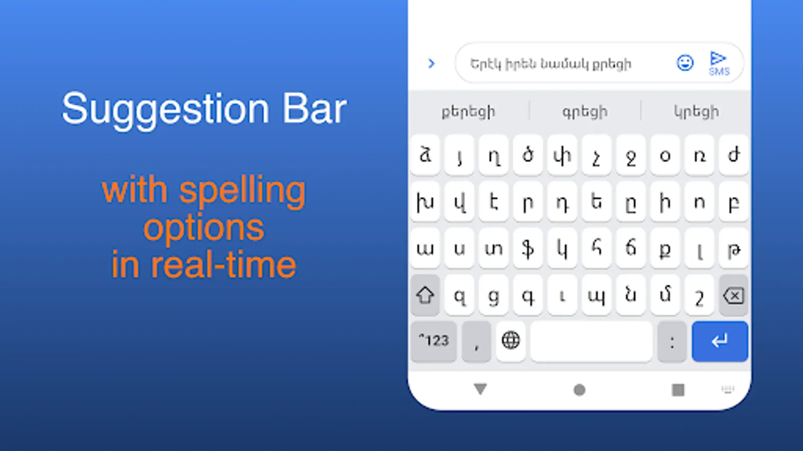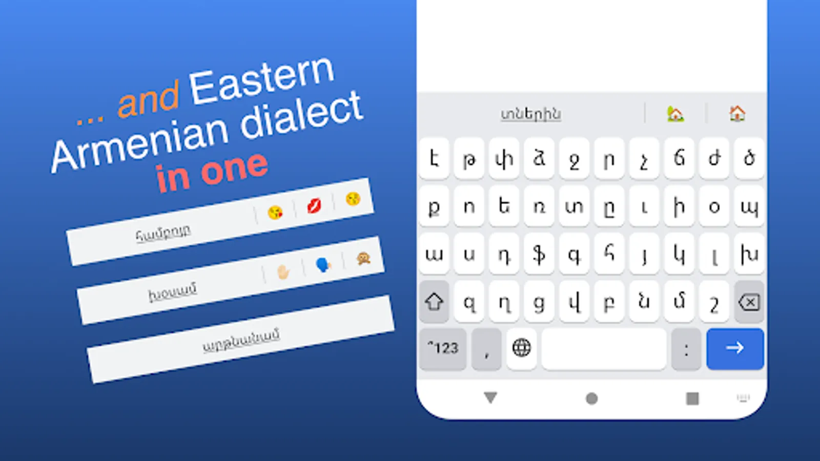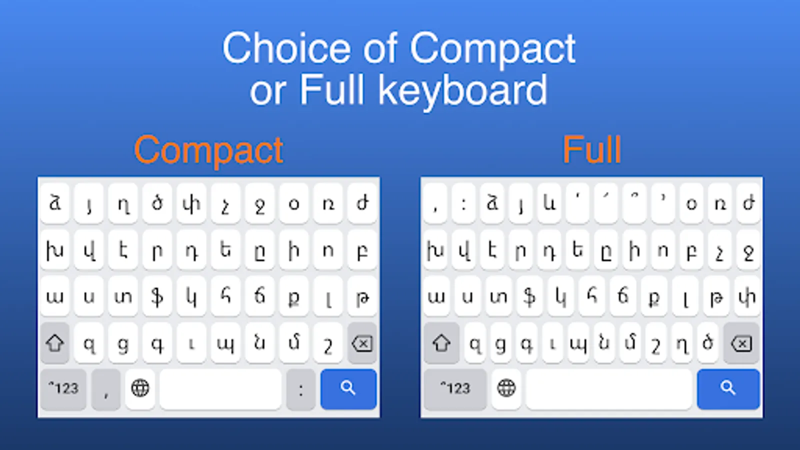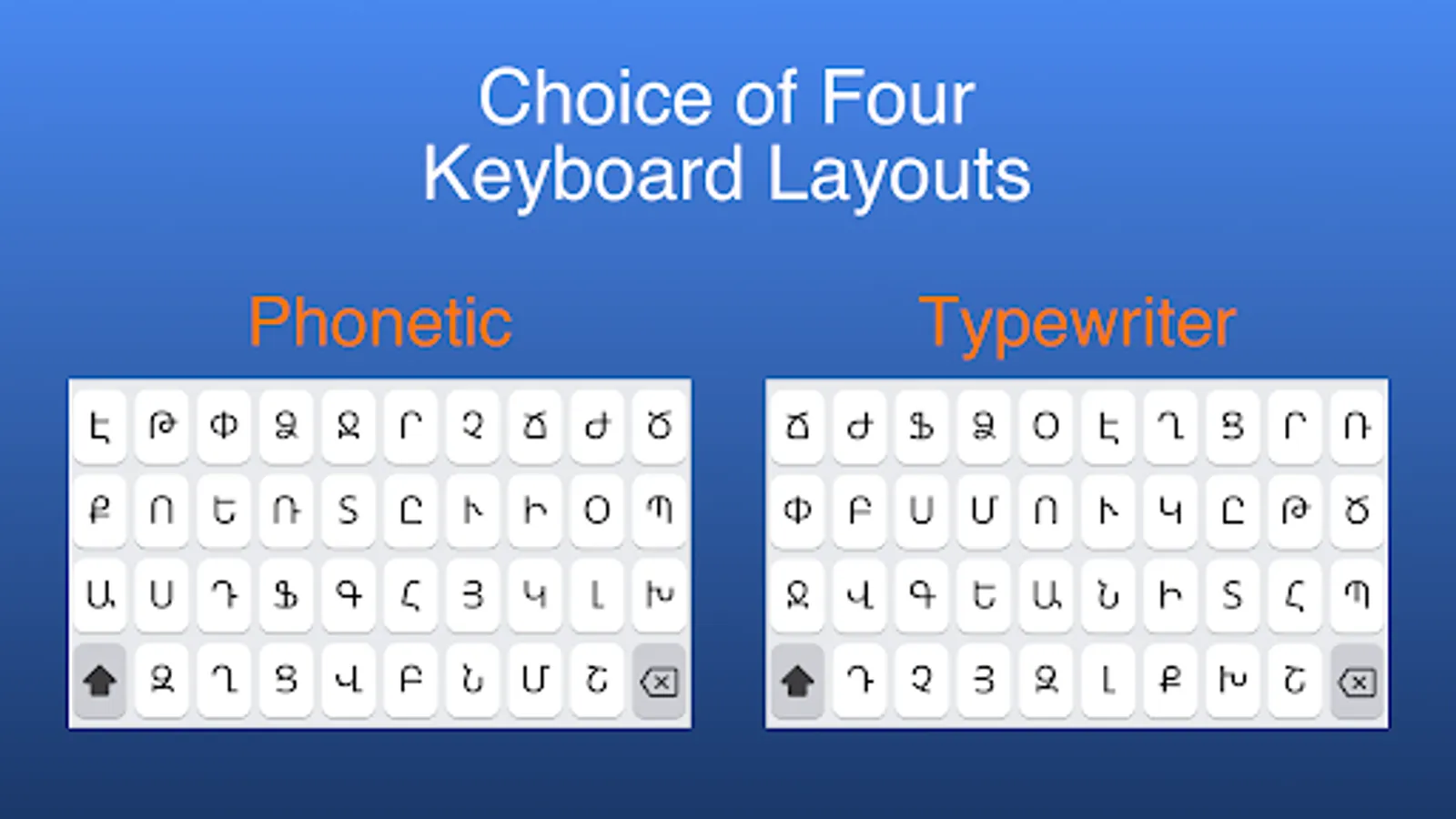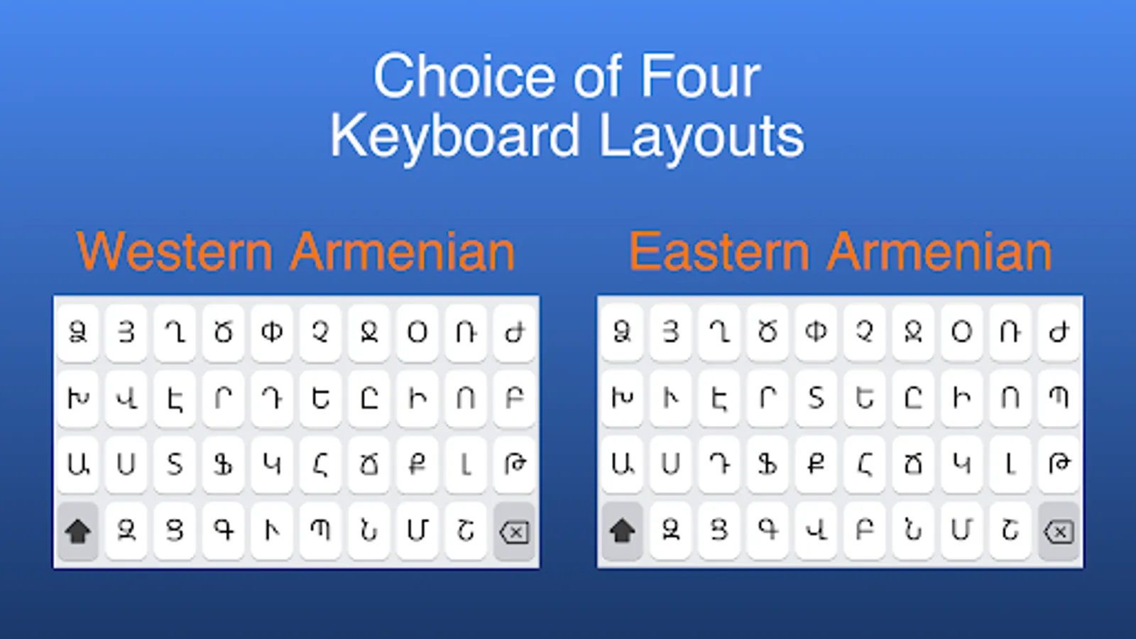 * Choice of the most popular keyboard layouts: Western Armenian, Eastern Armenian, Phonetic, and Typewriter