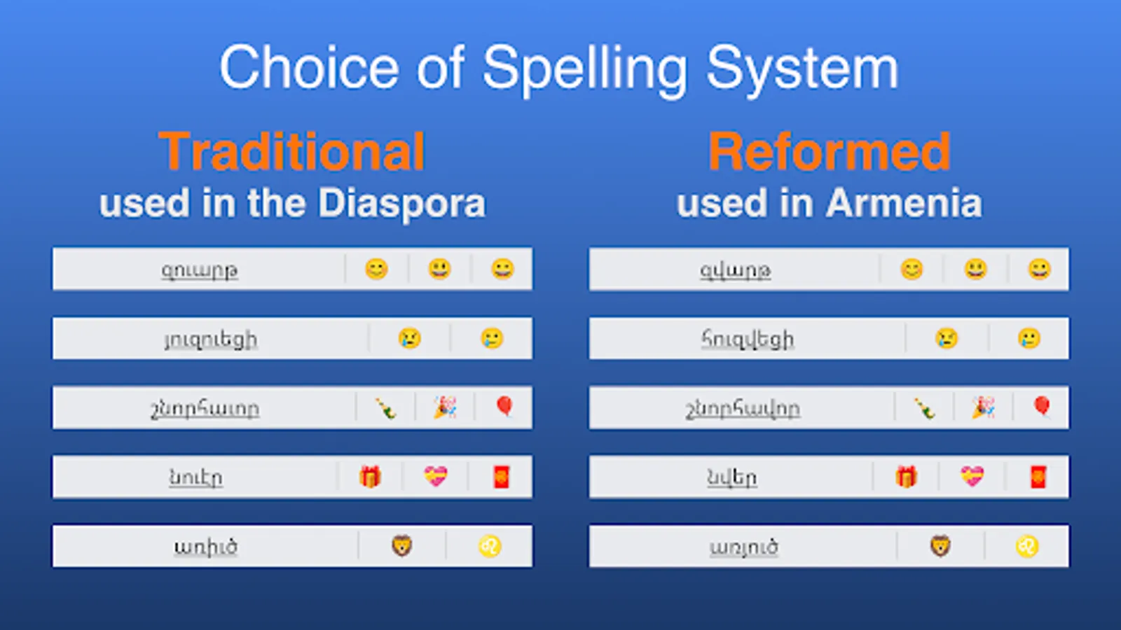 * Choice of traditional spelling (used in the Diaspora) or reformed spelling (used in Armenia)
