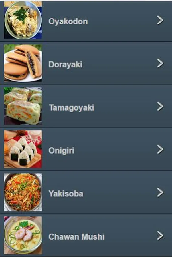 - Takoyaki - Okonomiyaki - Gyoza - Yakitori - Oyakodon - Dorayaki - Tamagoyaki - Onigiri - Yakisoba - Chawan Mushi