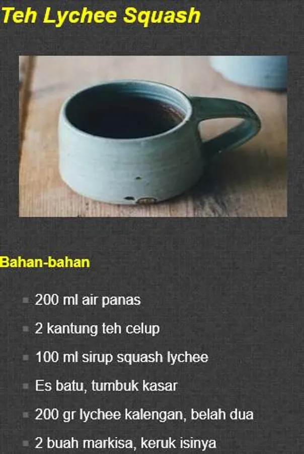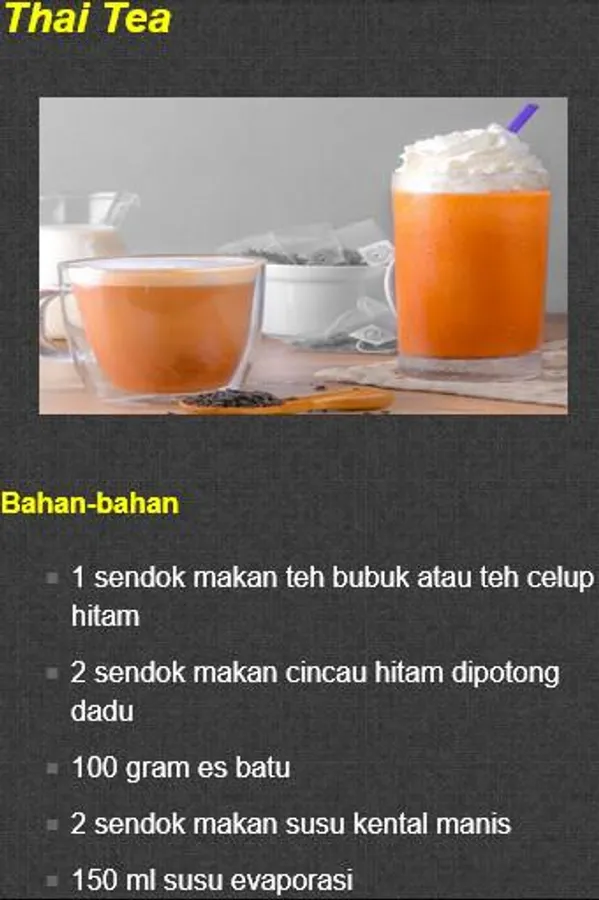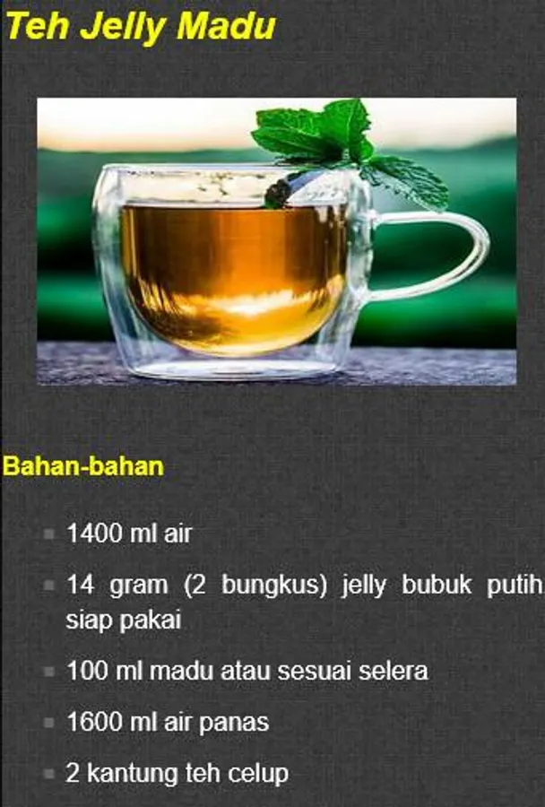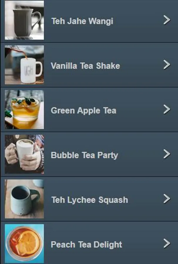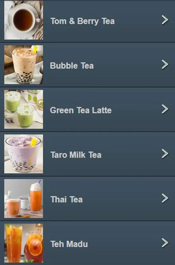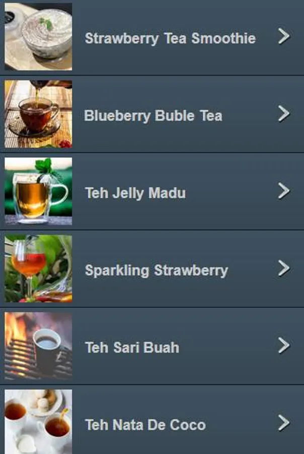 - Jelly Honey Tea - Nata De Coco Tea - Mutiara Buah Tea - Jahe Wangi Tea - Green Aple Tea - Buble Tea Party - Green Tea Frappucinno - Thai Tea - Green Tea Latte - Fruit Juice Tea - etc.