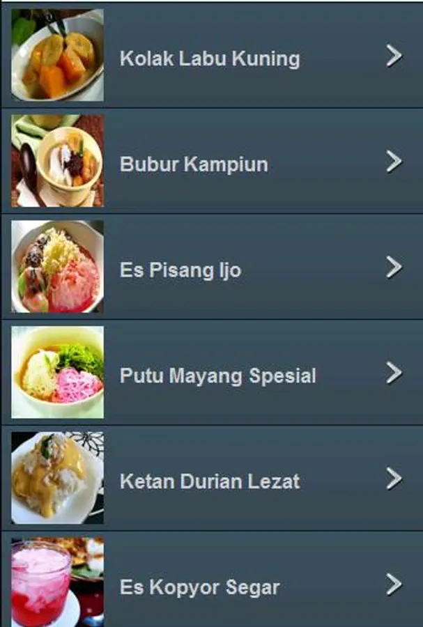 - Yellow Pumpkin Compote - Champion Porridge - Banana Ice Green - Putu Mayang Specials - Ketan Delicious Durian - Ice Kopyor Fresh - Delicious Fruit Soup - Cheese Pancake Dates - Thailand Cassava - etc.