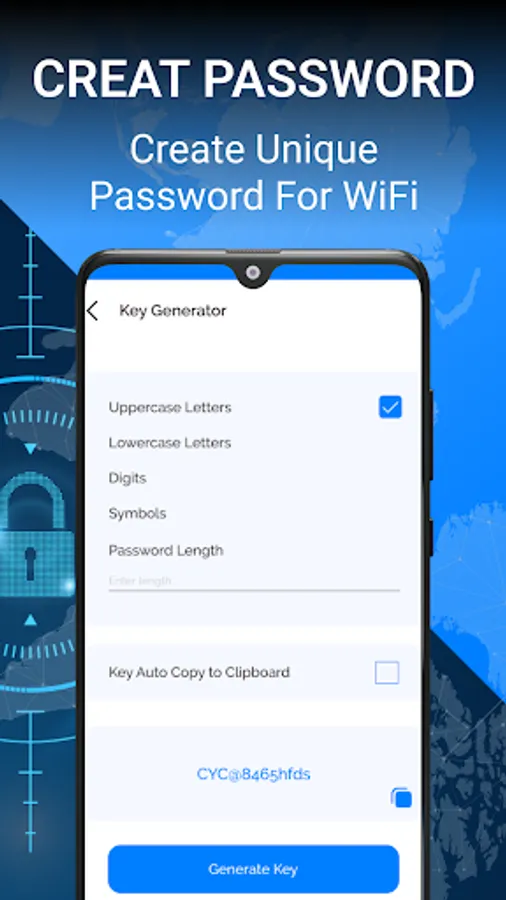 Wifi password creator is the best solution to protect your wifi from unwanted users. The stronger your wifi password the higher security you get. This wifi analyzer - password generator is the best way to protect your network from unauthorized access. Generate strong passwords for your network with this wifi password generator app.