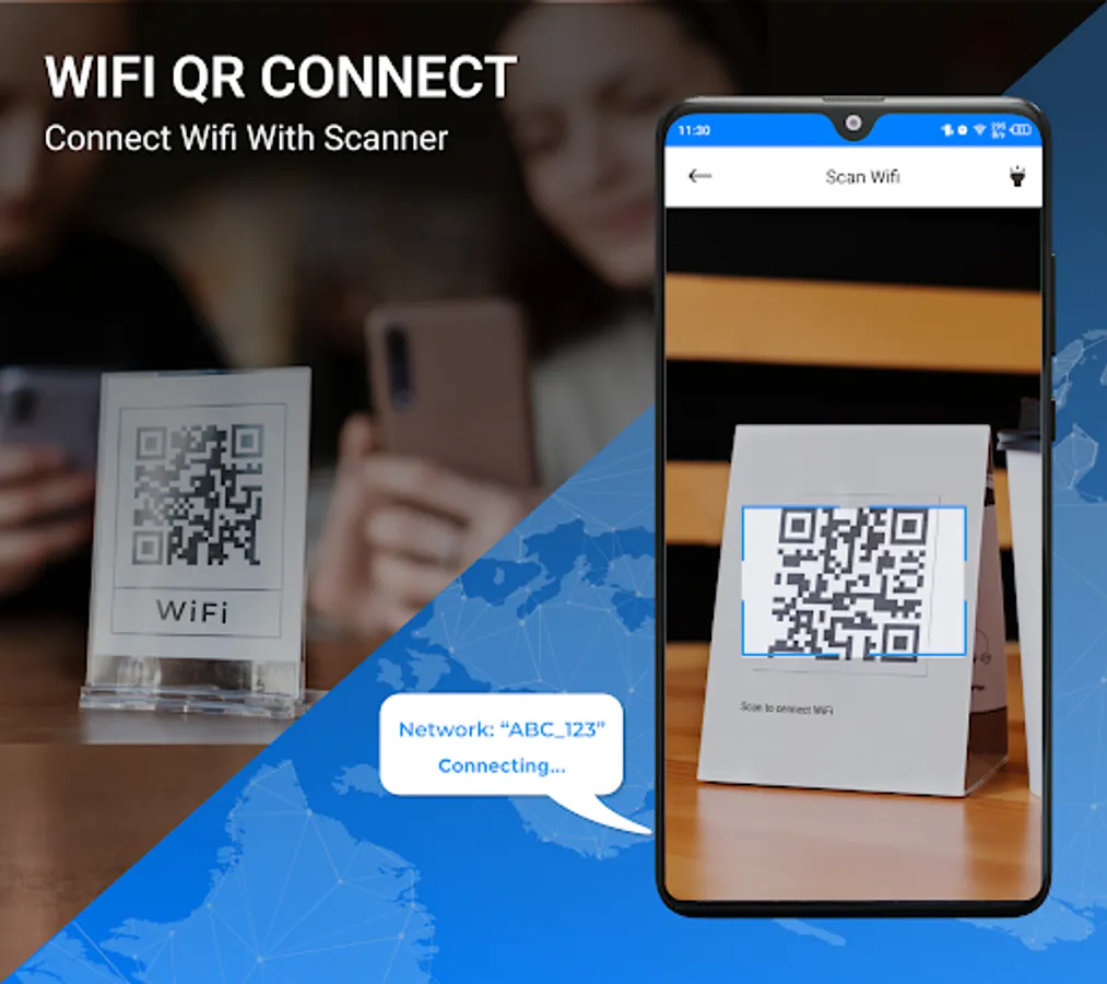 WiFi QR Connect - Wifi scanner allows you to connect easily to a WiFi network by scanning a QR code. You don't have to enter a password to connect with a wifi network, if you have Wifi QR connect feature. Open the WiFi QR option, scan the QR code of the wifi which you want to connect.