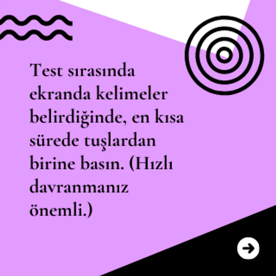 In the next step, your test starts immediately. Here you can check the options you have written in accordance with the parameters you encounter. Your speed is important here. Because, as a requirement of the paradigm used, its relationship with the option and question that comes to your mind first is an important situation.