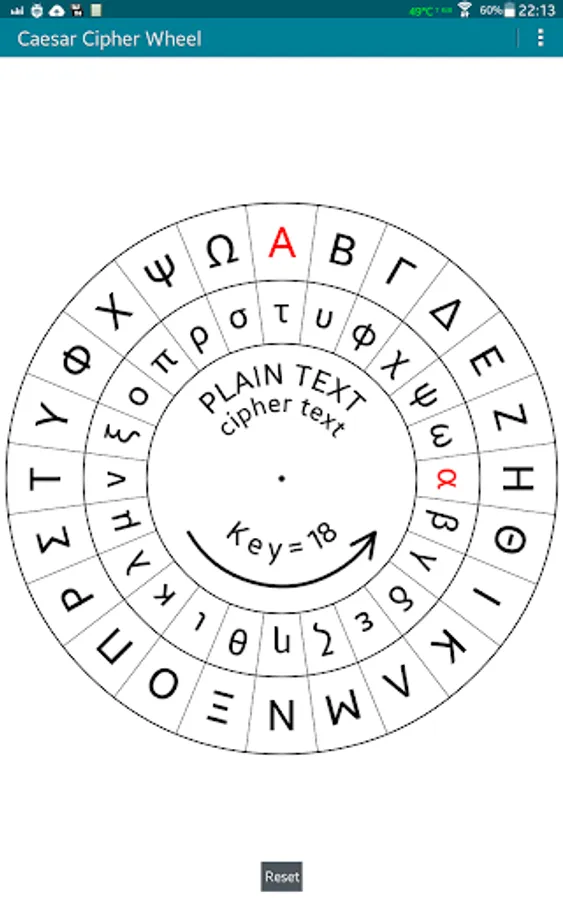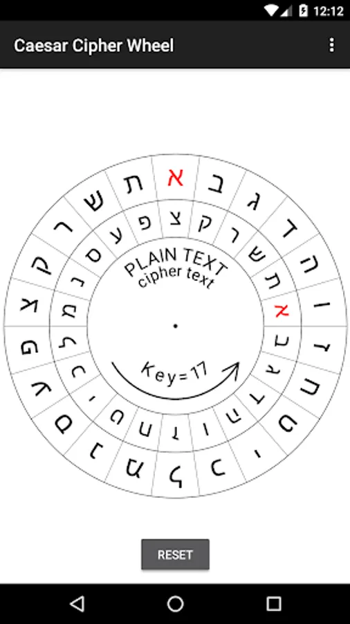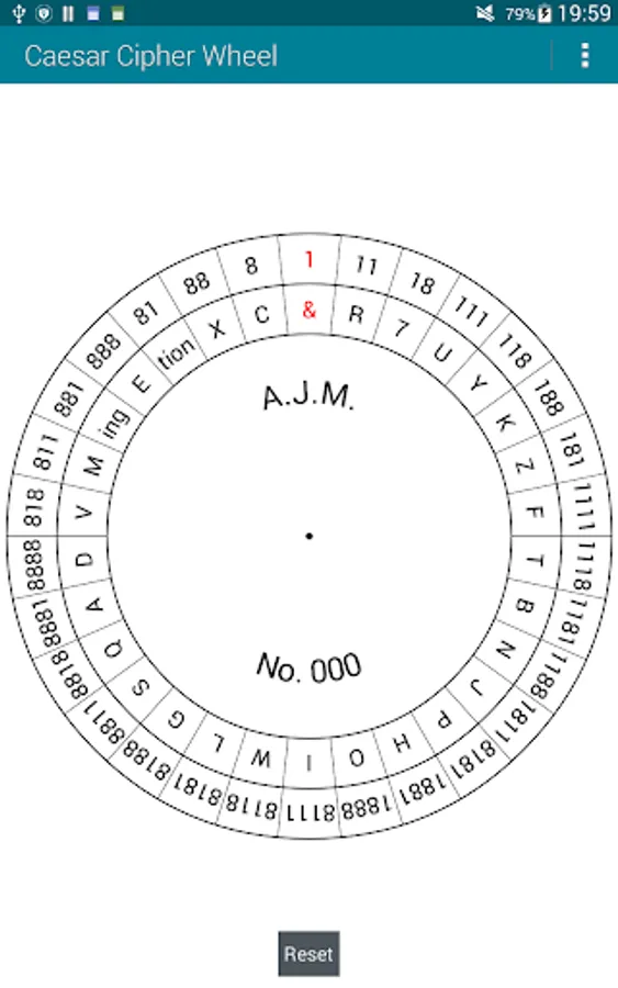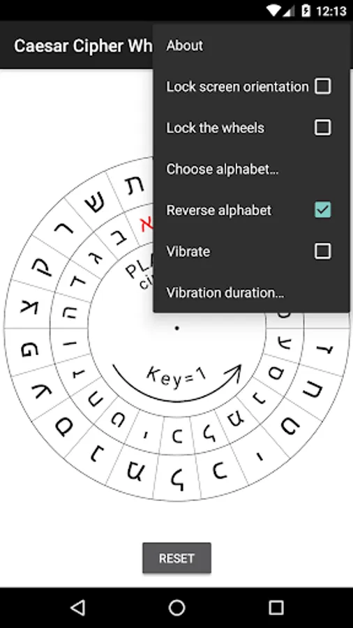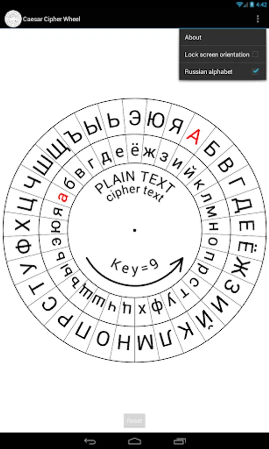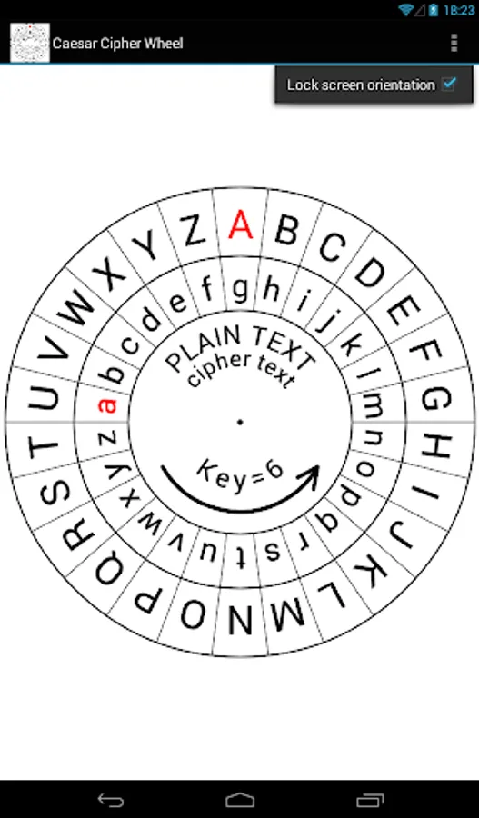 This is a very simple Caesar cipher disk. You can turn both wheels individually (or not). You can lock screen orientation, keep screen on, turn on vibrations and play a sound. You can reverse the selected alphabet ("atbash style").