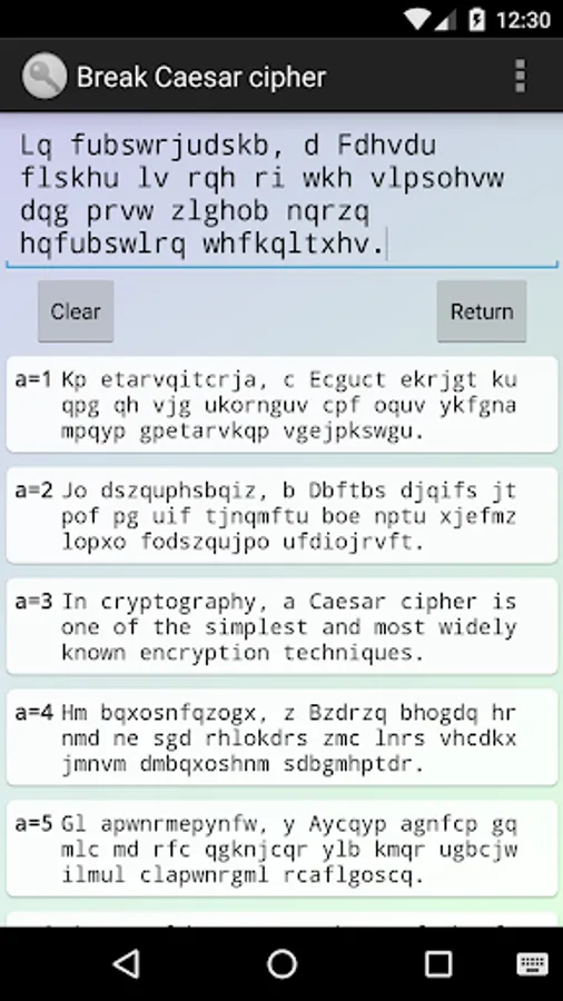 - Caesar cipher (Cryptanalysis included, with the possibility to use a convenient cipher wheel),