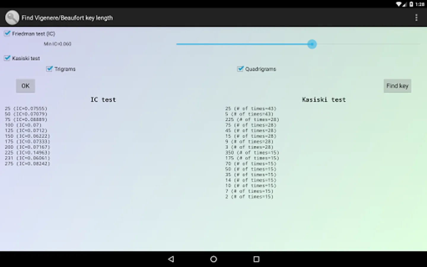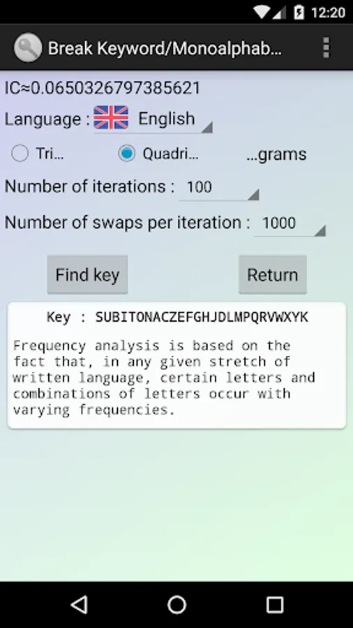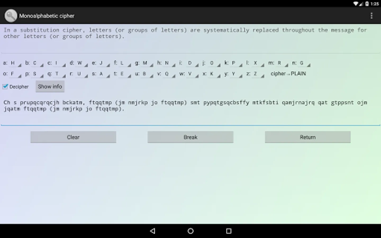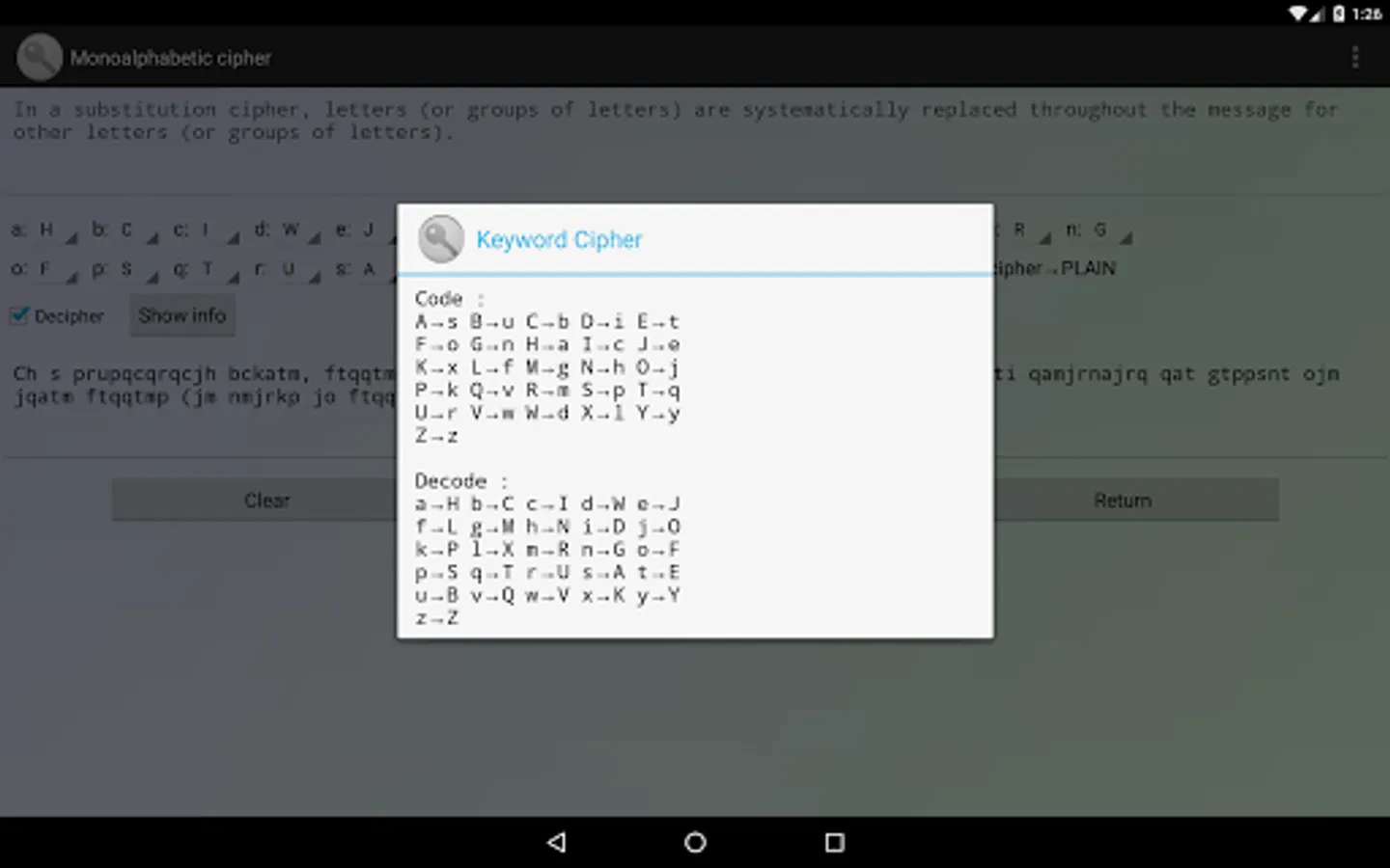 - Monoalphabetic substitution cipher with keyword or user-defined alphabet (Cryptanalysis included ***),