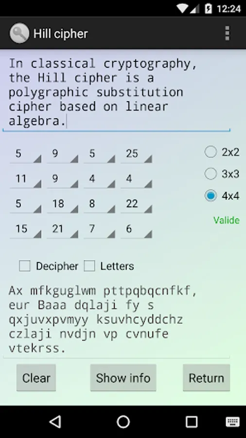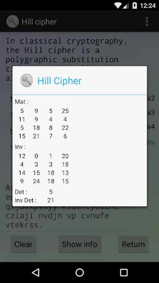 - Hill cipher (Matrix sizes : 2x2, 3x3 and 4x4) with the possibility to manage 3 matrices,