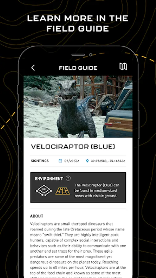 Track and research dinosaurs in your area with the Dinotracker AR app, the official companion app of Jurassic World Dominion. As a volunteer for the Department of Prehistoric Wildlife, you can interact with dinosaurs in your world and record your sightings.