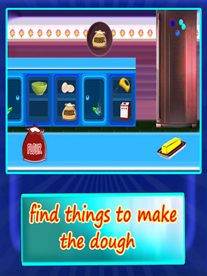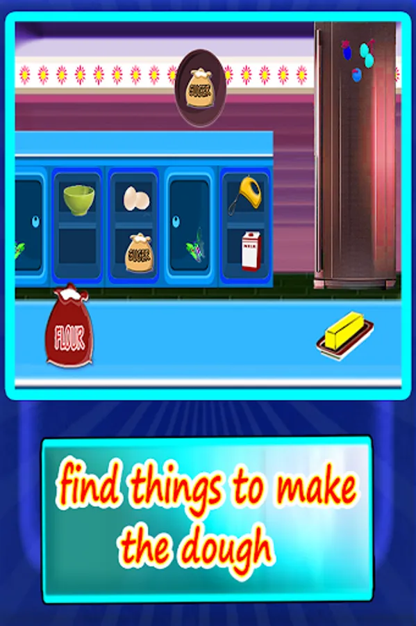 --> Kitchen puzzle: Find cutlery & crockery items like flour, sugar, blender, butter, eggs & bowl from kitchen cabinets.