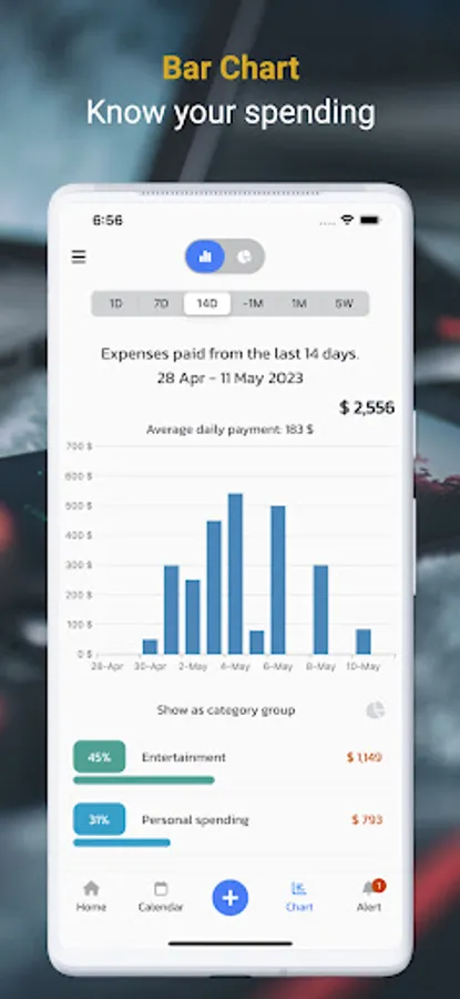 Organize your expenses with well-defined categories, and keep an eye on your daily spending with our daily and weekly charts.
