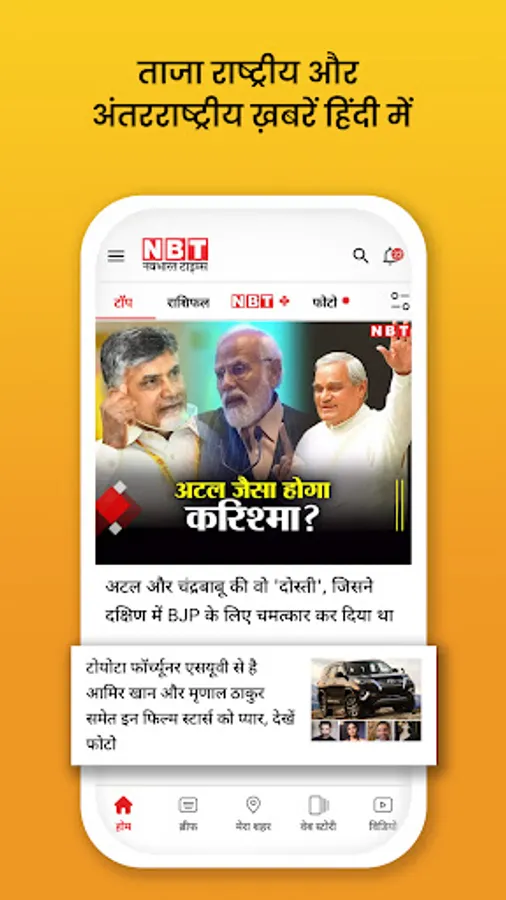 NBT Hindi News (हिंदी न्यूज़) app gives everything that a news reader is looking for like breaking news, headlines, trending stories, sports news, entertainment, business, & tech. Your daily trending news search ends with NBT News. No need to perform a Google search for celebrity gossip, business news, local city news, or sports news. NBT app provides news in shorts as photo galleries, visual stories, and trending photo stories.