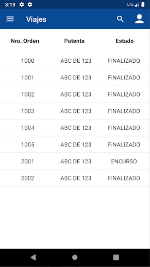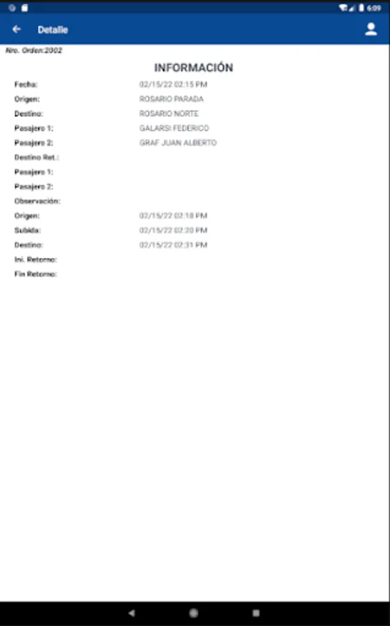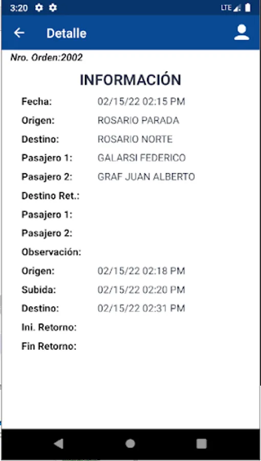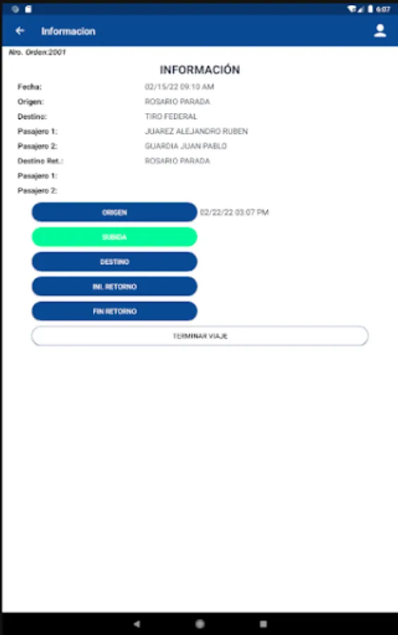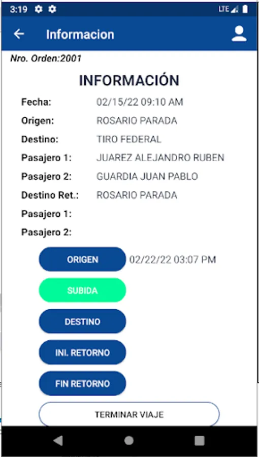 Travel tracking given a no. of order registering the geolocation, date and time of arrival at the origin, boarding of passengers, destination and if there is a return.