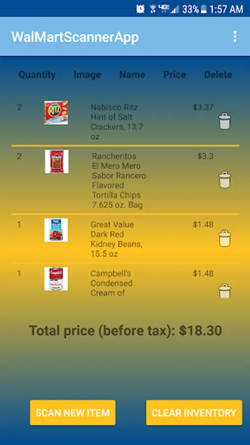 This app turns your phone's camera into a price scanner so that you can keep track of how much you are spending when shopping at Wal-Mart. It retrieves info directly from walmart's product database(image, name, price) and lets you edit the quantity of items you are buying.