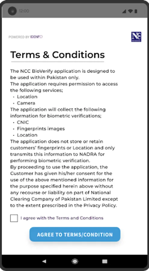 Resident Individual Pakistani Customers shall be required to ensure one-time biometric verification where they opt to open trading account through Customer Verification process. Such one-time biometric verification will be performed using NCCPL designated smartphone application called “NCC Bio Verify”