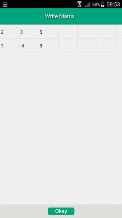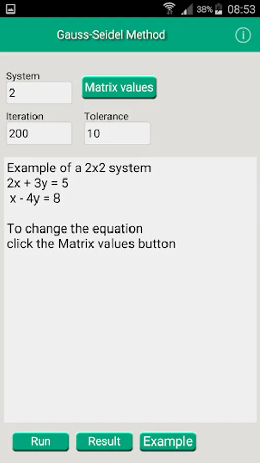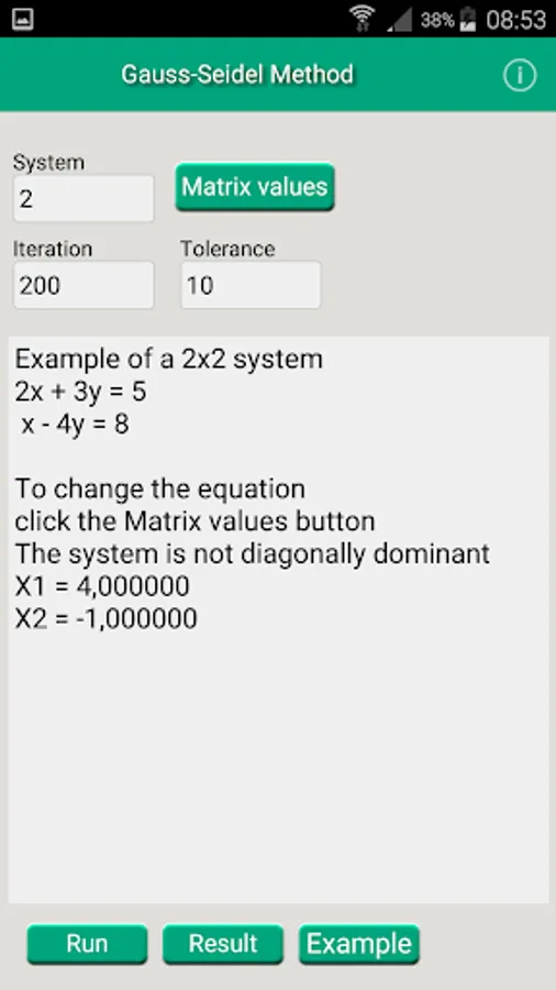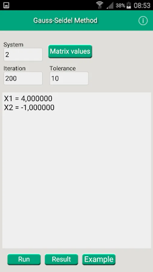 2) Fill the array by clicking the 'Matrix Values' button. The grid 'Matrix Equation' fill each row of the equation with its constant.