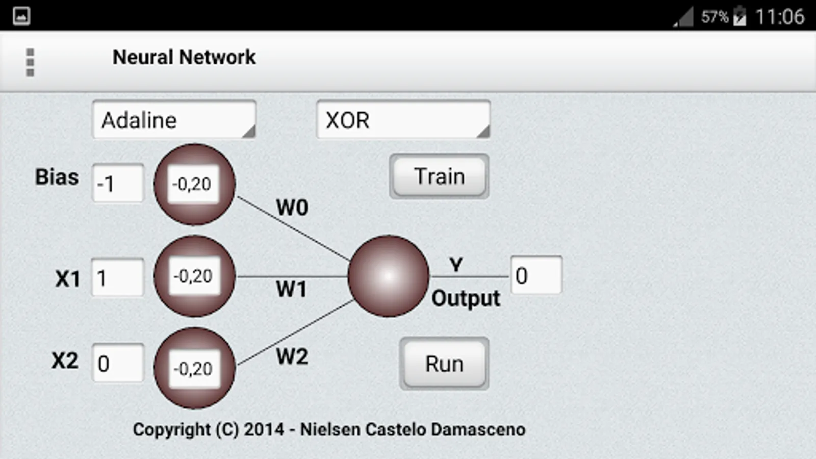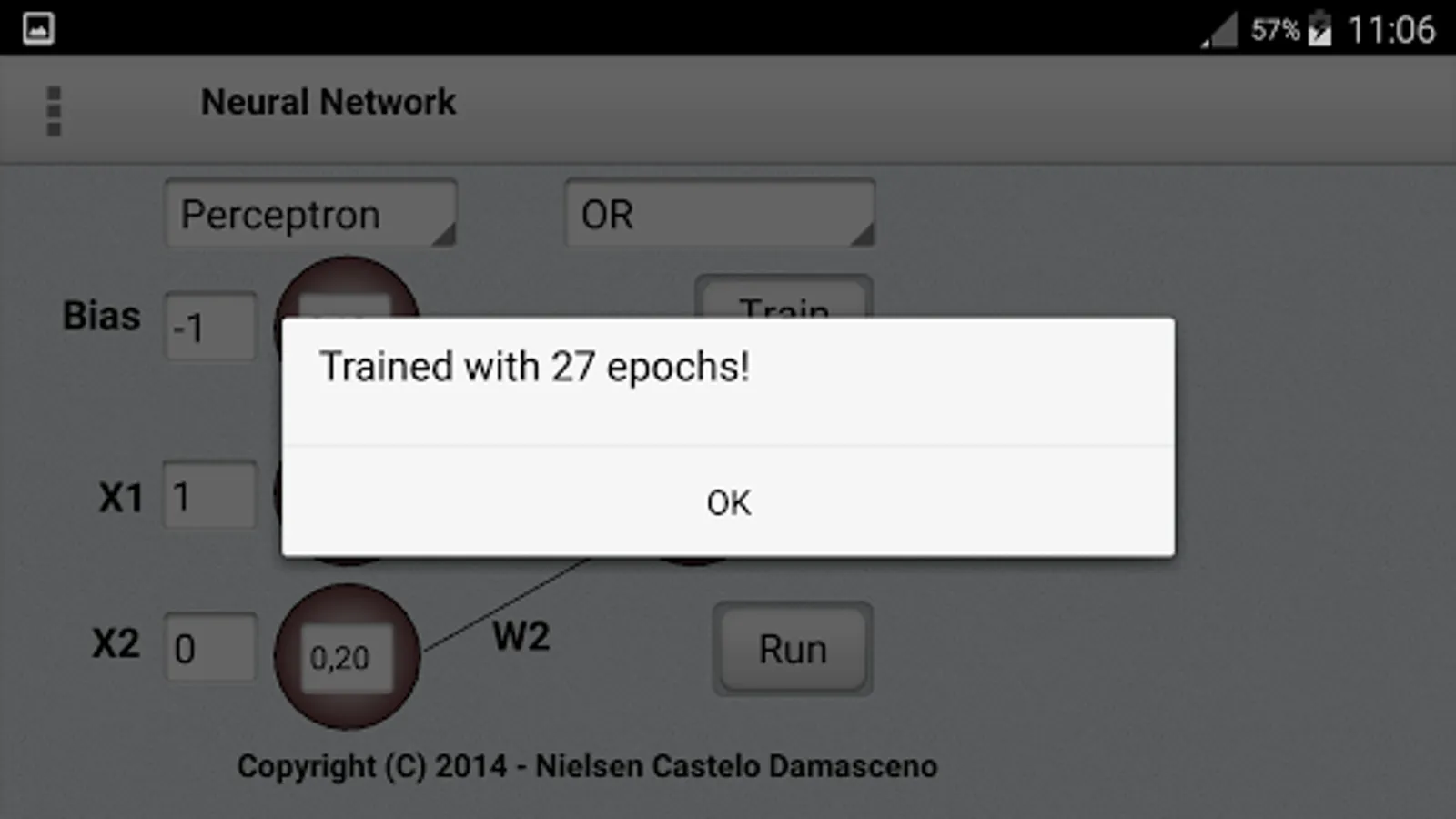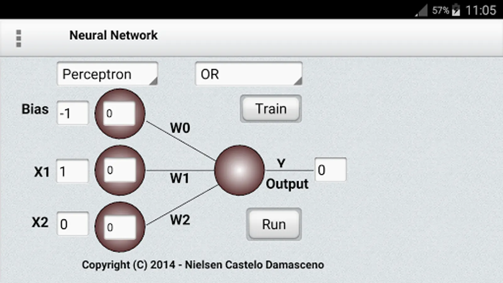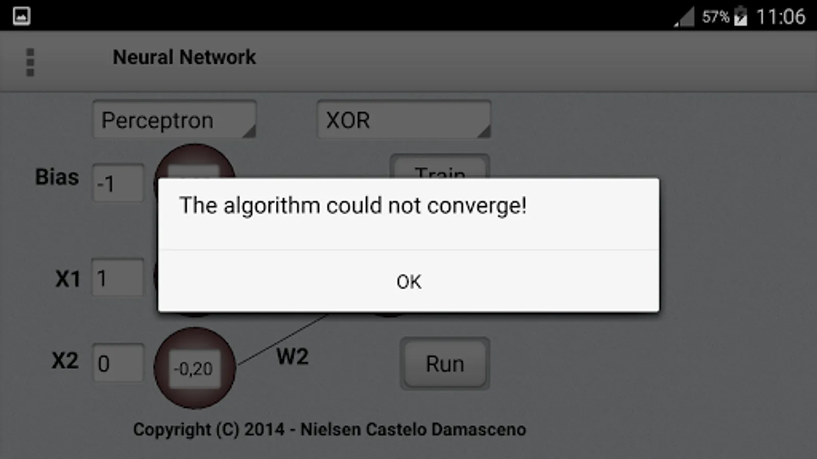 This program simulates the logic gates OR, AND, NAND, NOR, and XOR. Notice in the simulation que the XOR problem is not solved.