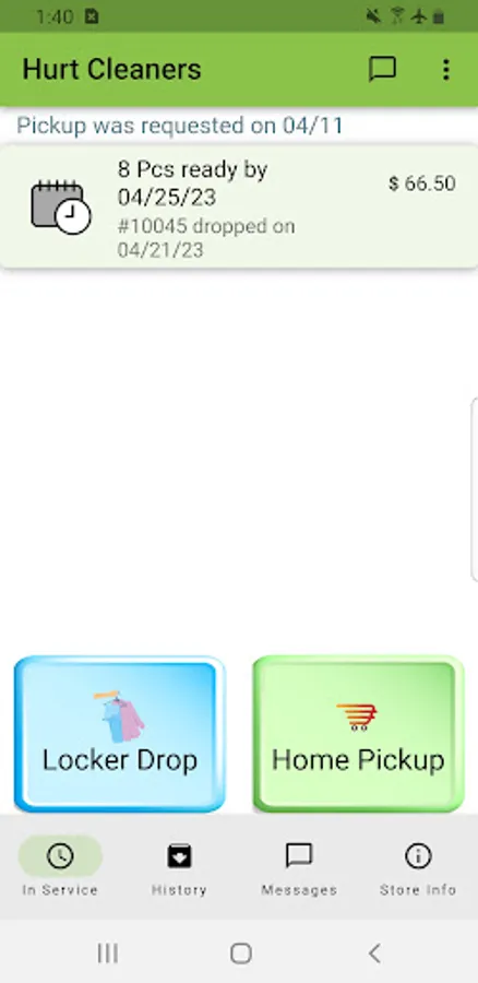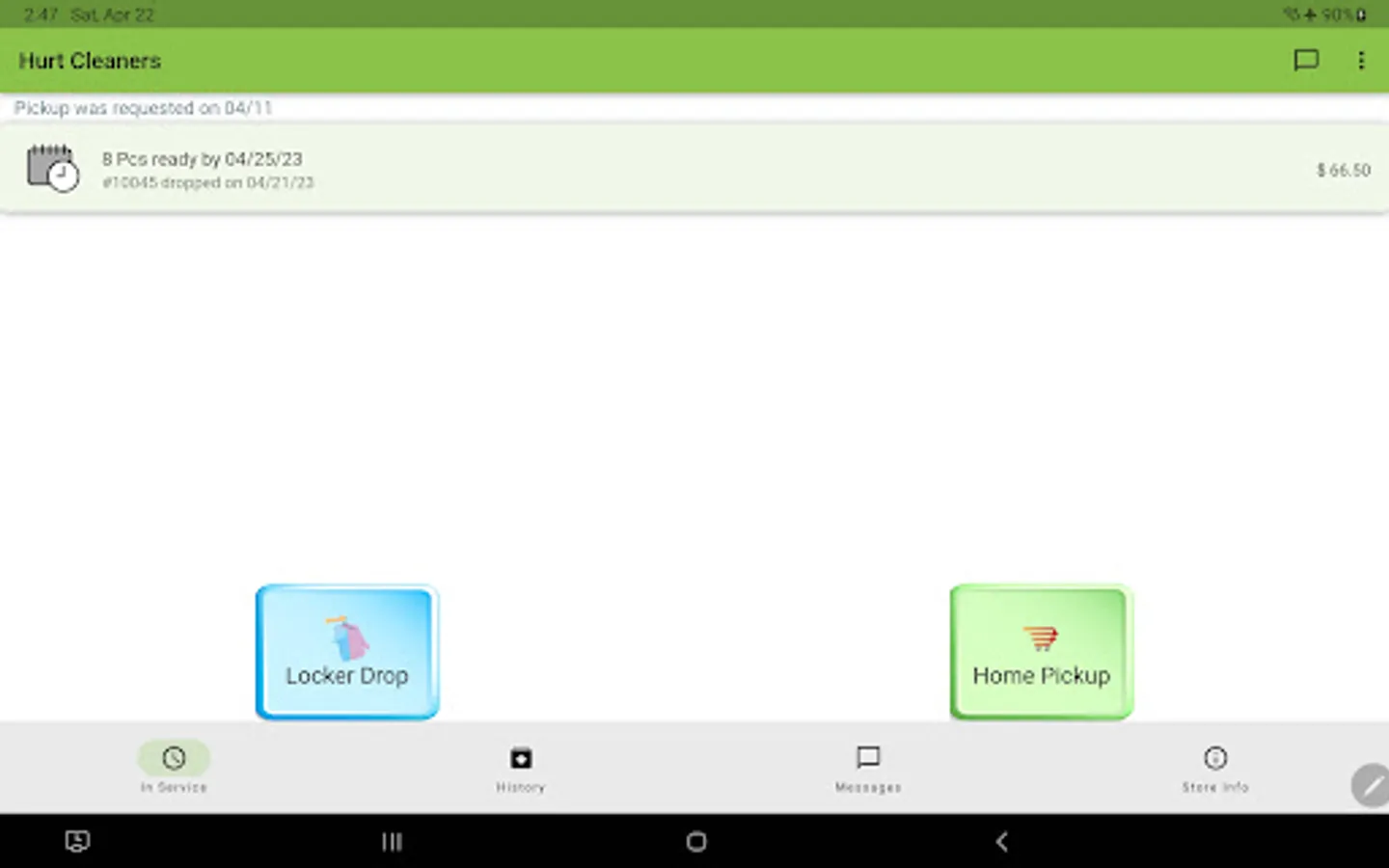 Hurt Cleaners customers can drop items in the 24 hour locker or request home pick up service. Service status notification tells the customer when the order is ready and will be delivered. Customers can also manage the order status and exchange messages with store clerk.
