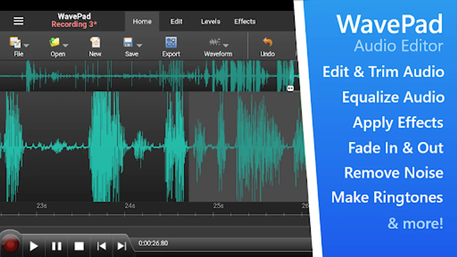 WavePad Audio Editor Free is a full-featured professional sound and audio editing application. Record, edit, add effects, and share your audio. Record and edit music, voice and other audio recordings. When editing audio files, you can cut, copy and paste parts of recordings, and then add effects like echo, amplification and noise reduction. WavePad works as a WAV or MP3 editor, but it also supports a number of other file formats.