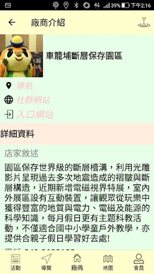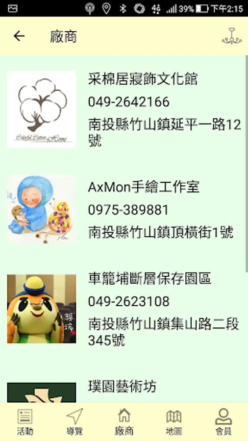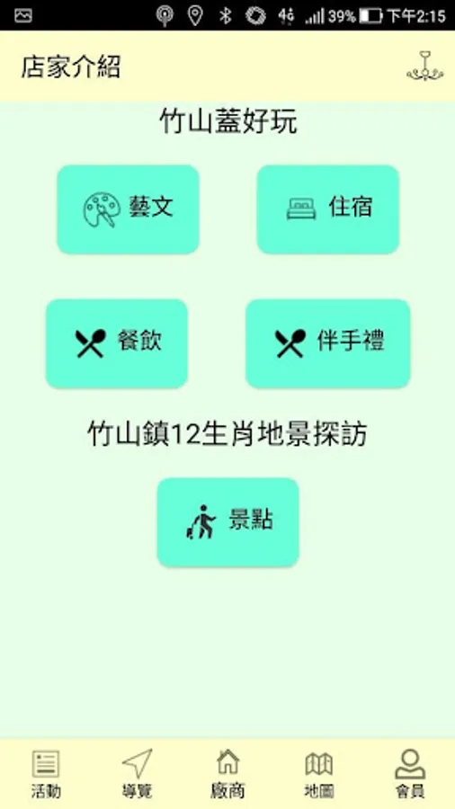 3. Vendors page: presents a list of stores in Zhushan, and is divided into categories such as "Arts", "Accommodation", "Food and Beverage", "Souvenirs", and "Attractions". Click to show the details of the vendors