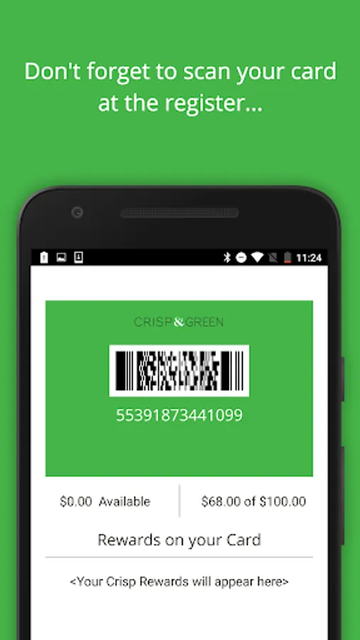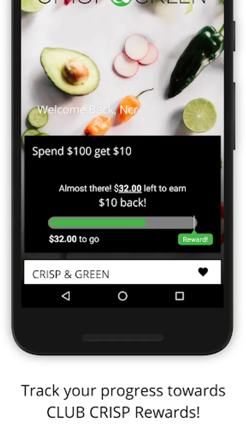 Live Crisp. Eat Green. Get Rewarded. Download our loyalty app to track all of your CRISP & GREEN purchases. Every time you reach $100, you'll be rewarded with a $10 credit. It's that simple! Who knew the perks of eating healthy could be so good!