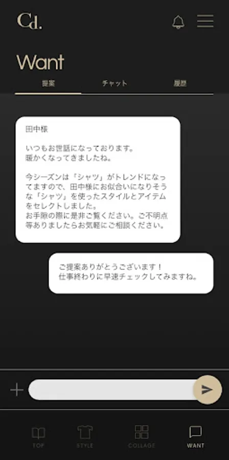 It is a coordination management app that realizes a lifestyle with a stylist 365 days a year. A creative team centered on stylists who are active at the forefront of the industry will provide total support for your fashion life, from your exclusive magazine and item proposals to purchases and fittings.