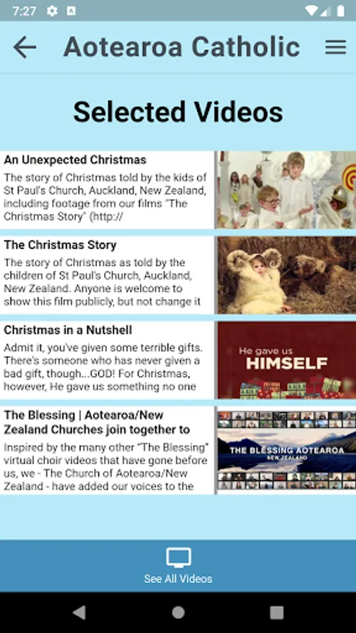 Access to a list of selected video's from the Aotearoa Catholic YouTube channel. A shortcut to the full channel is also available.