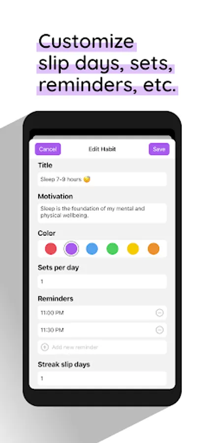 Build Habits Slowly solves this problem by giving you the power to decide how many "slip days" you want to give yourself before your streak breaks. For daily habits, I've found that one slip day is perfect for me. This gives me enough flexibility to miss a day, but keeps me motivated to not miss two days in a row.
