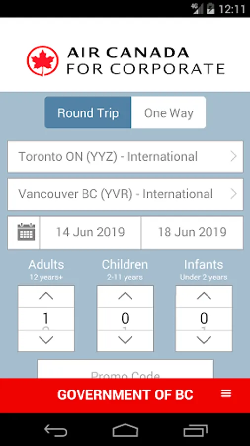Though you don't have to be a BC Government employee to book Air Canada with the App; simply enter as a guest, search and book.
