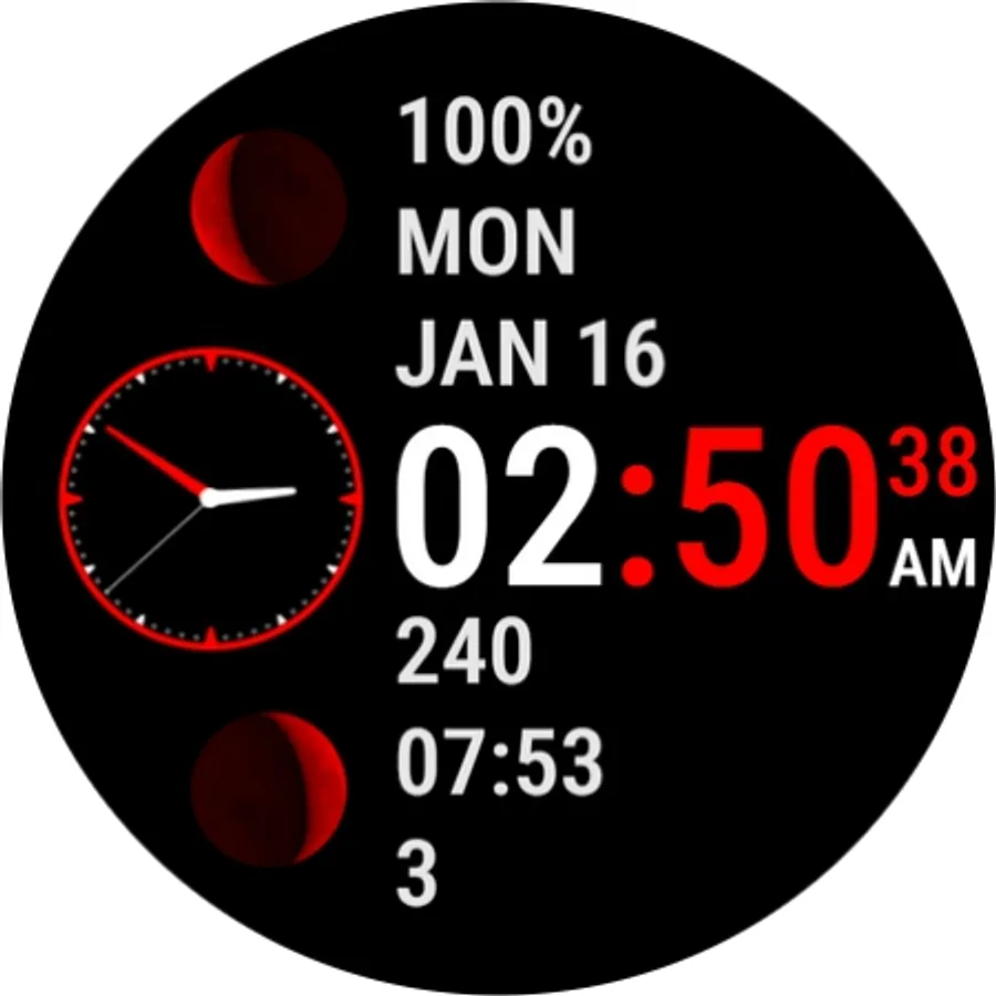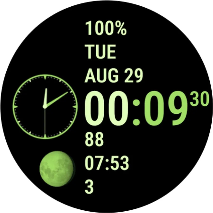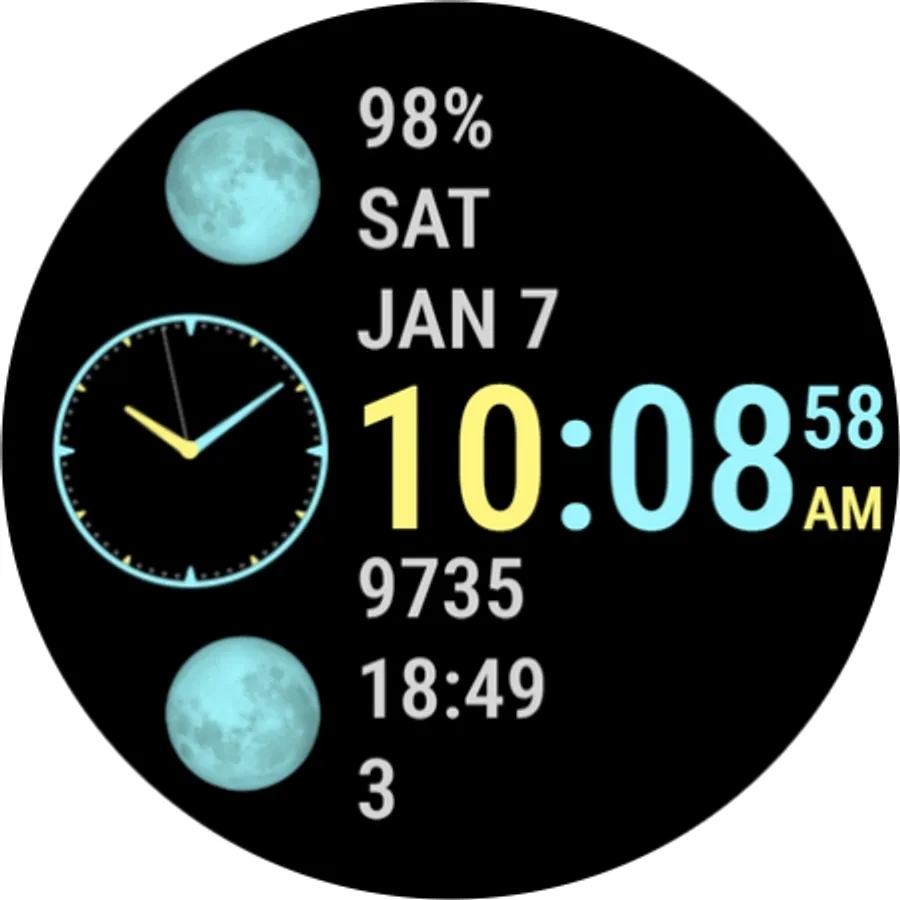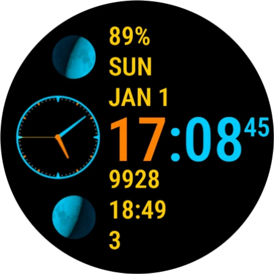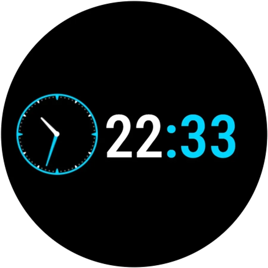Hybrid watch face is a hybrid of analog and digital clock in one watch face with 6 complications.