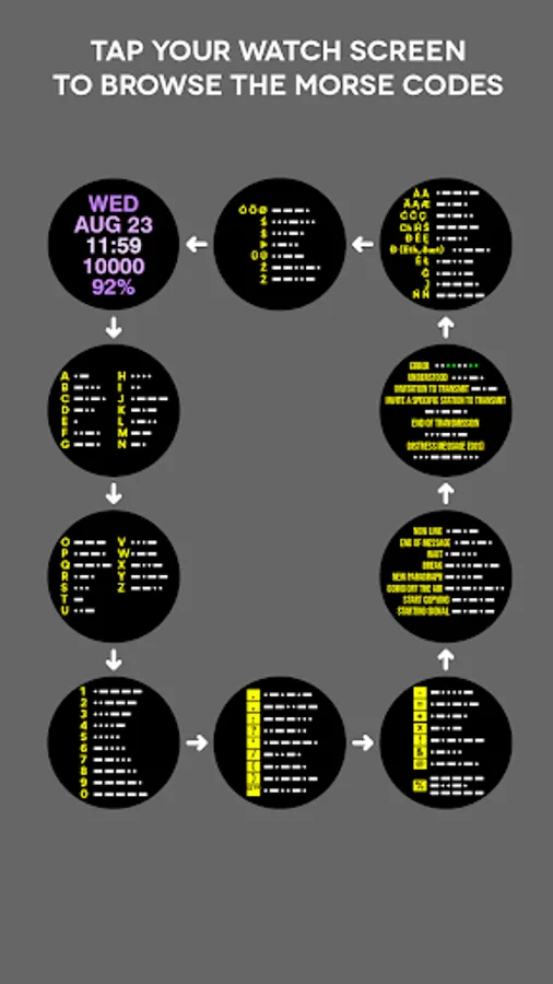 Tap on the watch face repetitively to browse through the 9 pages of Morse Code list and back to the watch face again.