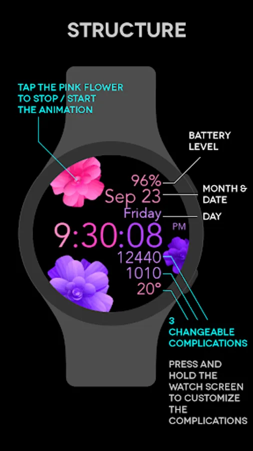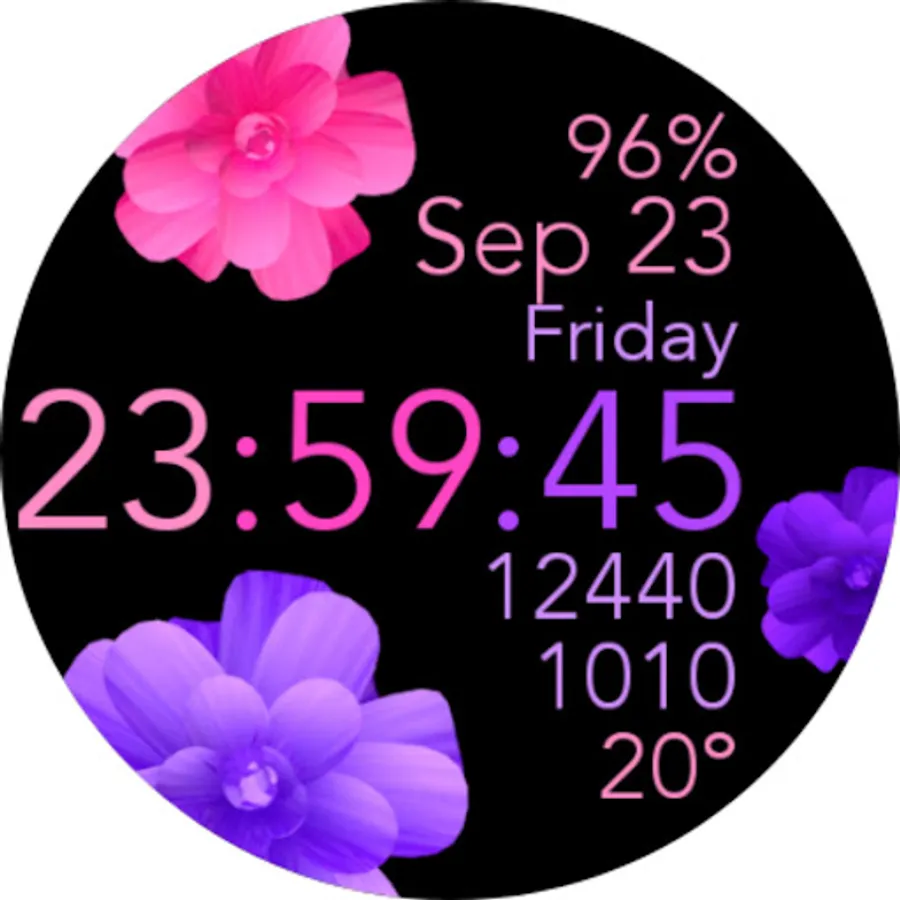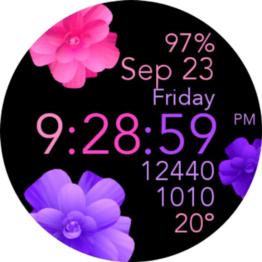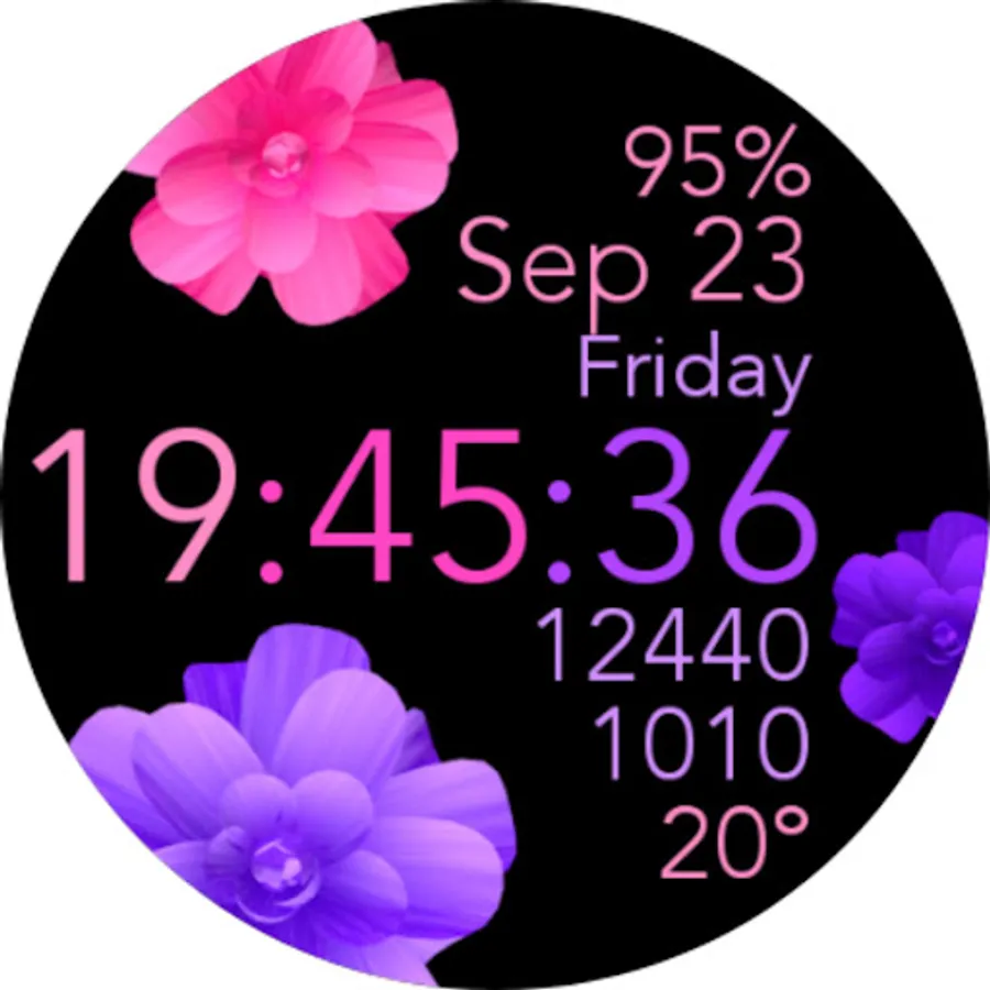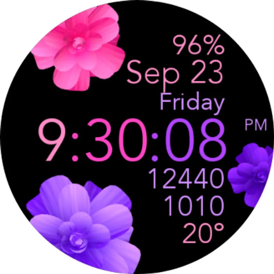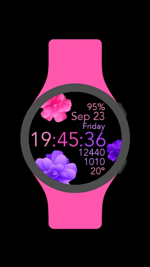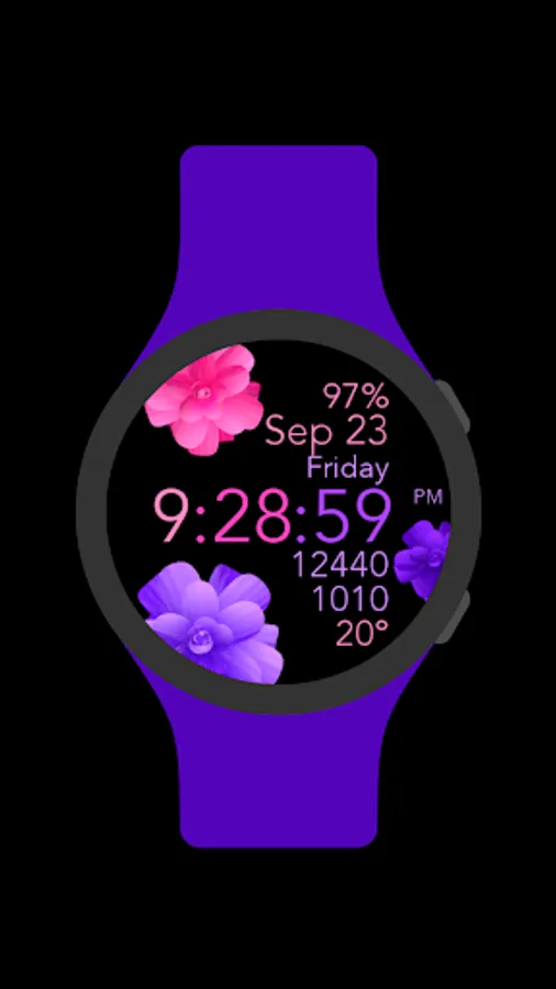 This is a beautiful animated pink and purple flowers watch face for Wear OS smartwatches.