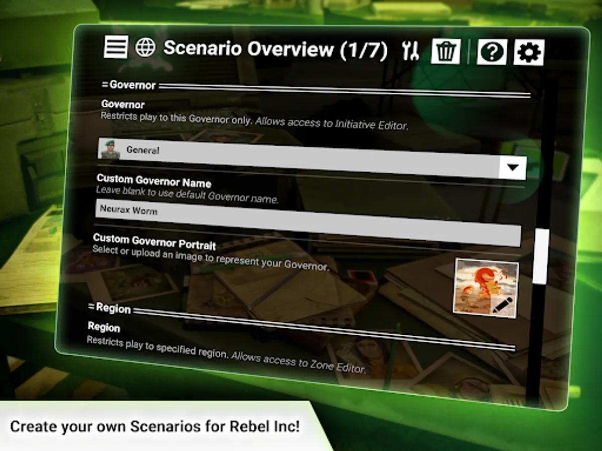 The Rebel Inc: Scenario Creator is a powerful yet easy to use content creation tool which lets players bring their best ideas to life as they develop their own custom scenarios for Rebel Inc. and then share them with the world.
