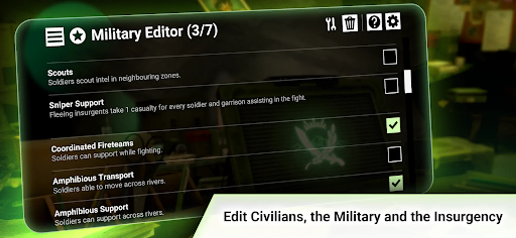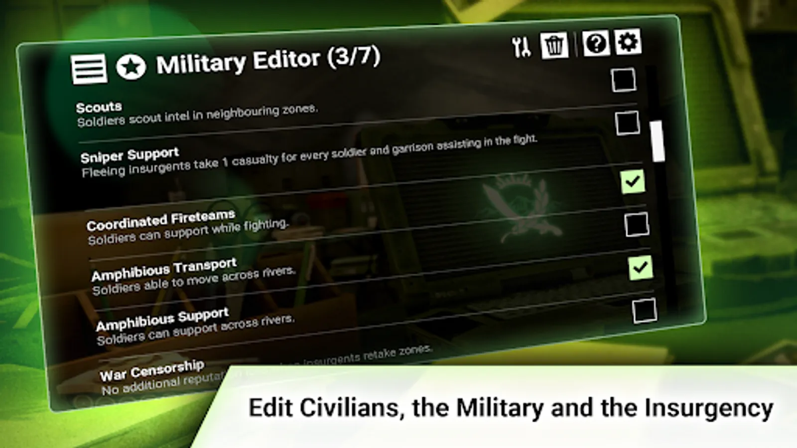 Change the Game: Dive into the nuts and bolts of the game’s mechanics to configure Civilian, Military, Insurgent and Zone variables, radically changing the way Rebel Inc. plays!