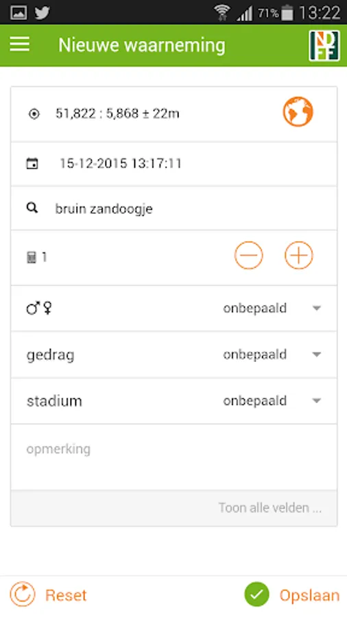 Online and offline your observations in nature introduce GPS and offline card before using this app. Your tablet or phone with GPS and WIFI make the observation are recorded at the right time and place. It is also possible to designate himself a spot on the map, or use a different date / time. Are you ready to enter, you can upload your observations to your account observers in NDFF entry portal or www.telmee.nl. Do not have an account yet? Please register as an observer on www.telmee.nl. or ask your NDFF portal administrator for your account.