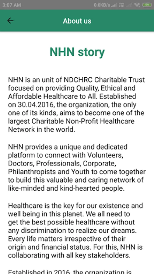 Established in 2016, the organization, the only one of its kinds, aims to become one of the largest Charitable Non-Profit Healthcare Network in the world. NHN provides a unique and dedicated platform to connect with Volunteers, Doctors, Professionals, Corporate, Philanthropists and Youth to come together to build this valuable and caring network of like-minded and kind-hearted people. Healthcare is the key for our existence and well being in this planet. We all need the best possible healthcare without any discrimination to survive, prosper and realize our dreams. Every life matters irrespective of their origin and financial status. For this, NHN is actively collaborating with all key stakeholders.
