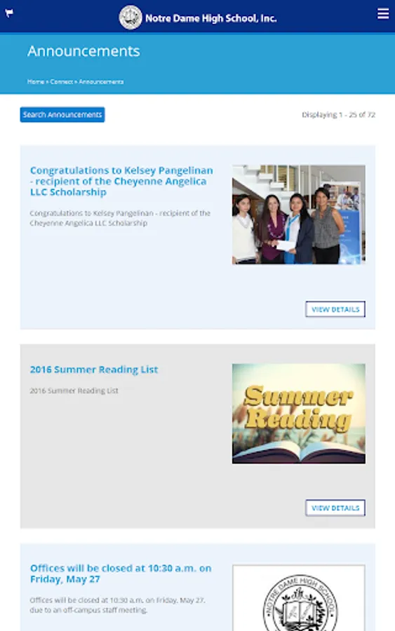 This is the free, official app for Notre Dame High School, Inc. (NDHS Guam). The app is beautifully designed and loaded with current information, ideal for Students, Parents, Administration, Faculty, and Staff. Some of the most useful features of the app include instant Notifications (if you opt in), Announcements, Events Calendar, and School Calendar. Plus, you can find more content about NDHS through the various sections in the app. Keep informed with what's happening at NDHS by having the app just a tap away on your device. Enjoy and God Bless!