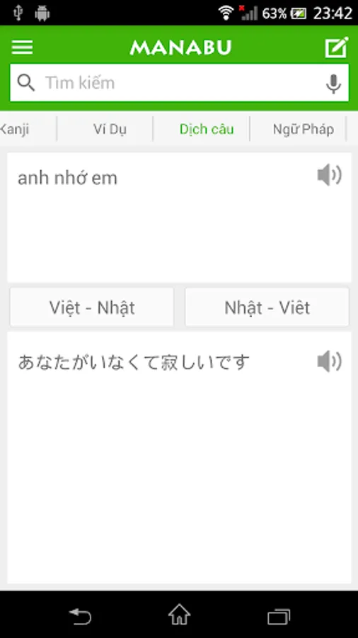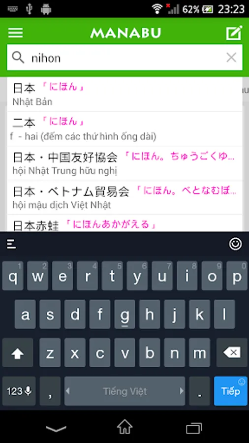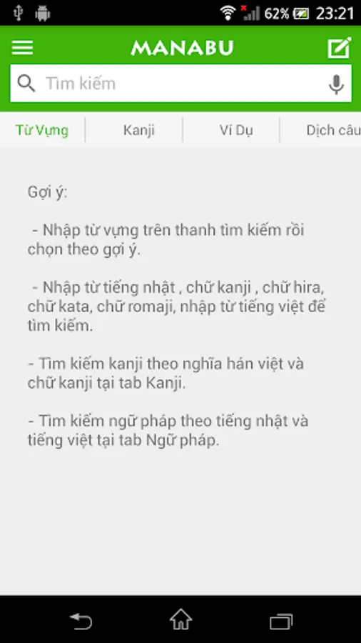 Từ điển Tiếng Nhật Manabu - Ứng dụng từ điển song ngữ Việt-Nhật Nhật-Việt tốt nhất trên điện thoại Android. Với lượng từ vựng phong phú, nhiều chức năng tiện ích cùng với tốc độ tra từ siêu nhanh và dung lượng app siêu nhẹ. Rất thích hợp cho các bạn đang học tiếng Nhật và các bạn sinh viên, nhân viên làm việc công tác tại Nhật bản