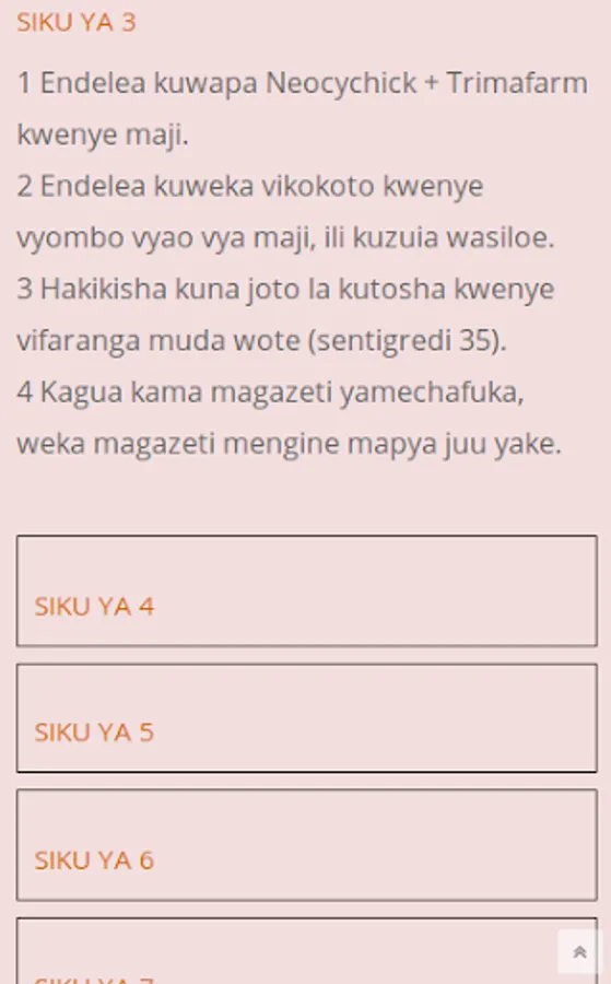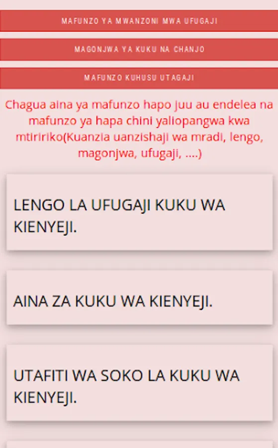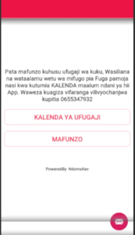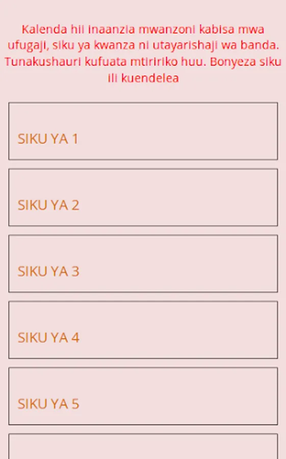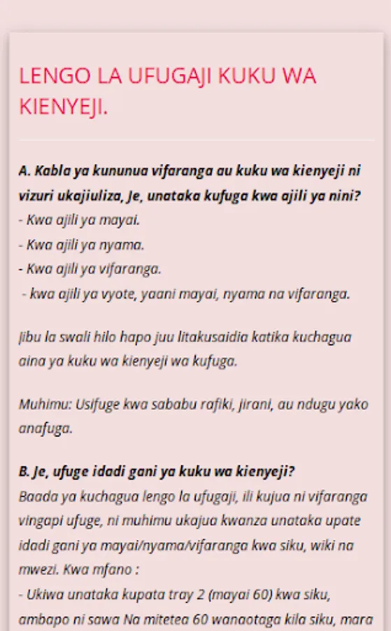 This app enables anyone to keep chickens even if they do not have any knowledge of these breeds. Through the "Chicken Calendar" App you will be trained from the very beginning of your poultry project, how to prepare capital, Poultry vaccinations, chicks, market as well as non-payment. You also get a calendar that will guide you on how to care for your chickens and how to serve them every day from the first day.
