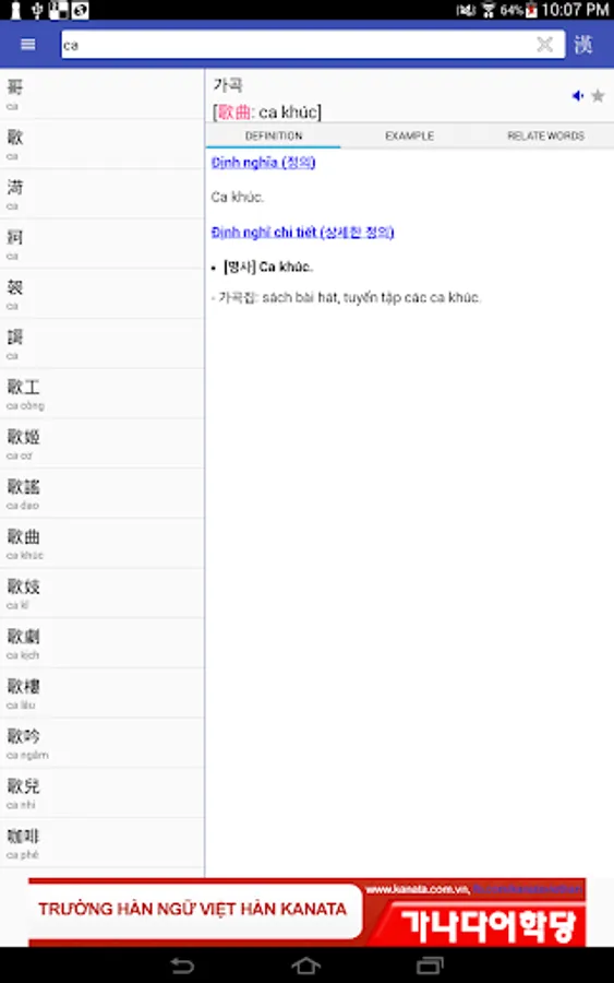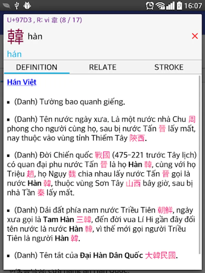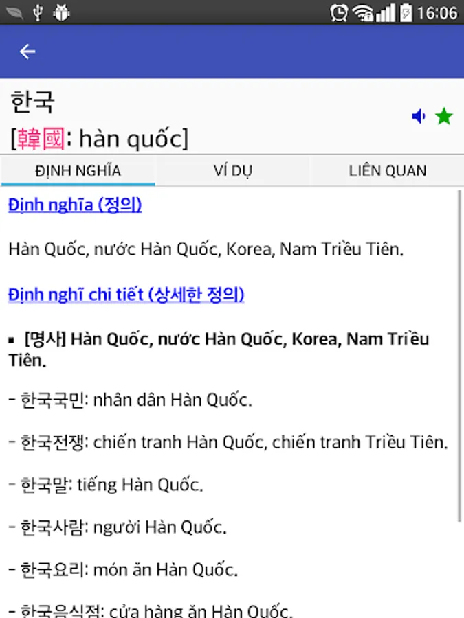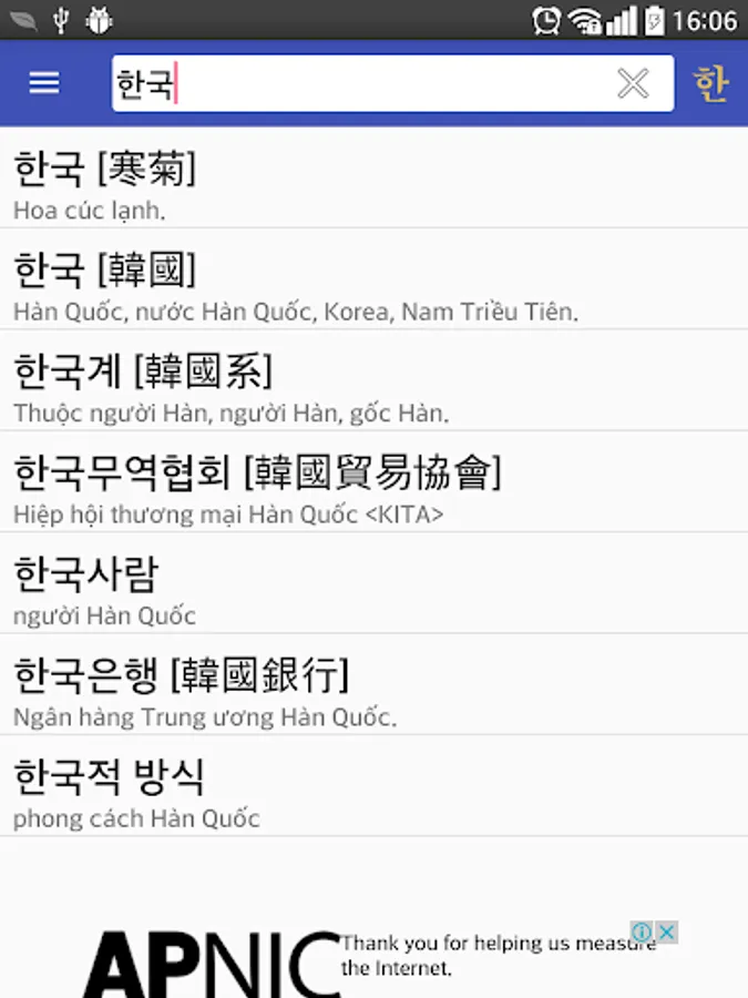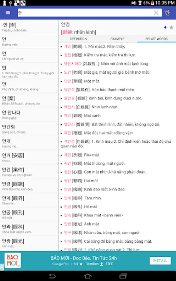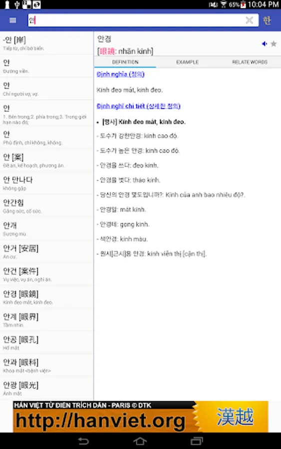 There is a tight relationship between Korean and Vietnamese through the vast number of cognate words originated from Chinese. In Korean, they are called Hanja (한자) while in Vietnamese, they are called Han Viet words. Understanding this relation makes it easy for Vietnamese to learn Korean and vice versa. This is main purpose of our dictionary.