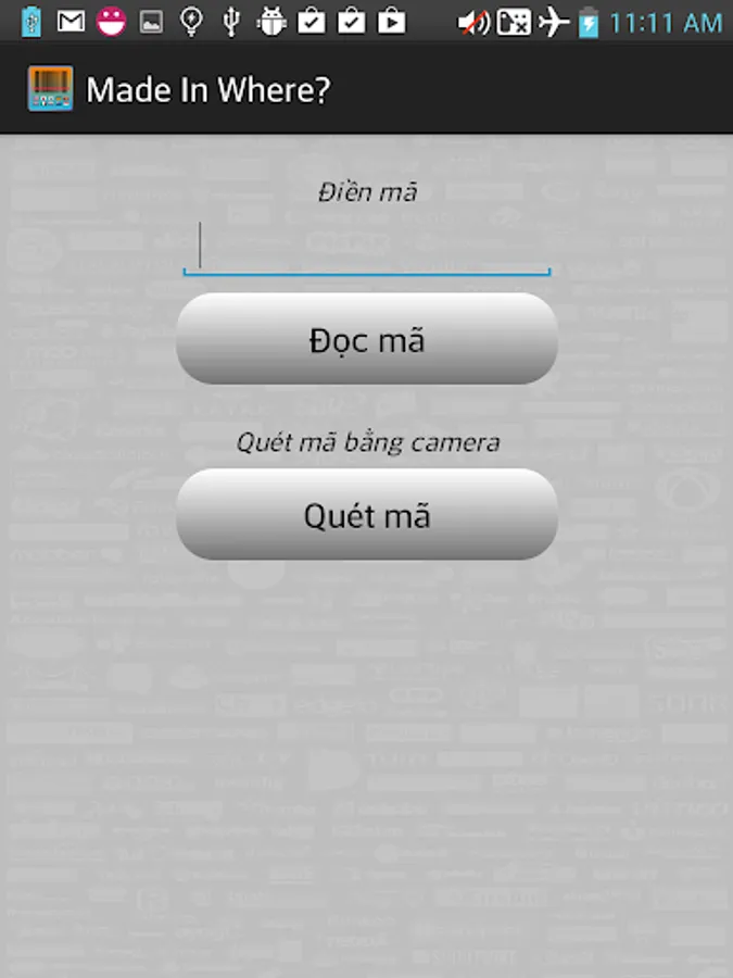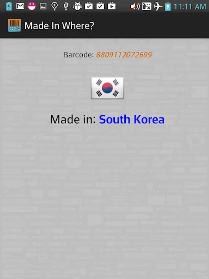 This application reads or scans bar code to recognize where the product made in (product origin). It requires Barcode Scanner application installation on device to scan the barcode (you can get it from: https://play.google.com/store/apps/details?id=com.google.zxing.client.android).