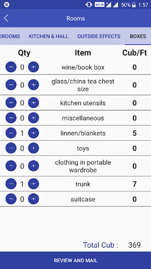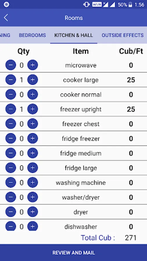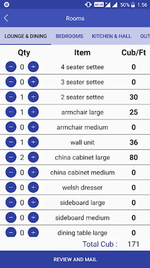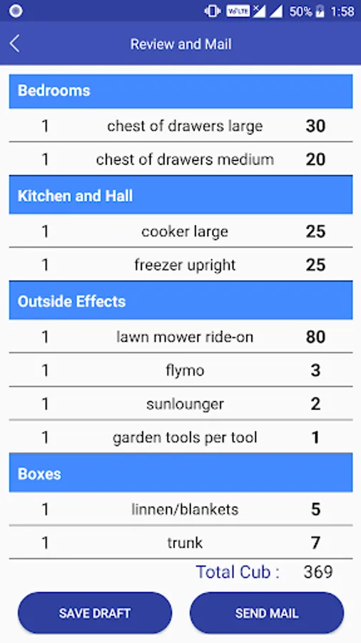 Designed for a removal company to enter a client's details for moving and using a vast list of possible contents choses the furniture and effects from that property to compile a list and total volume to be moved and then can email or save that list from his or her tablet or phone.