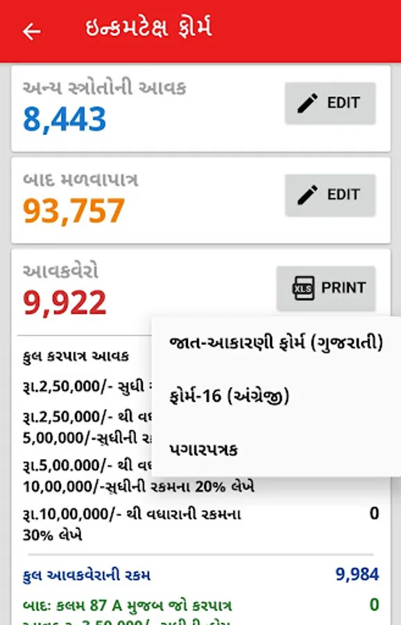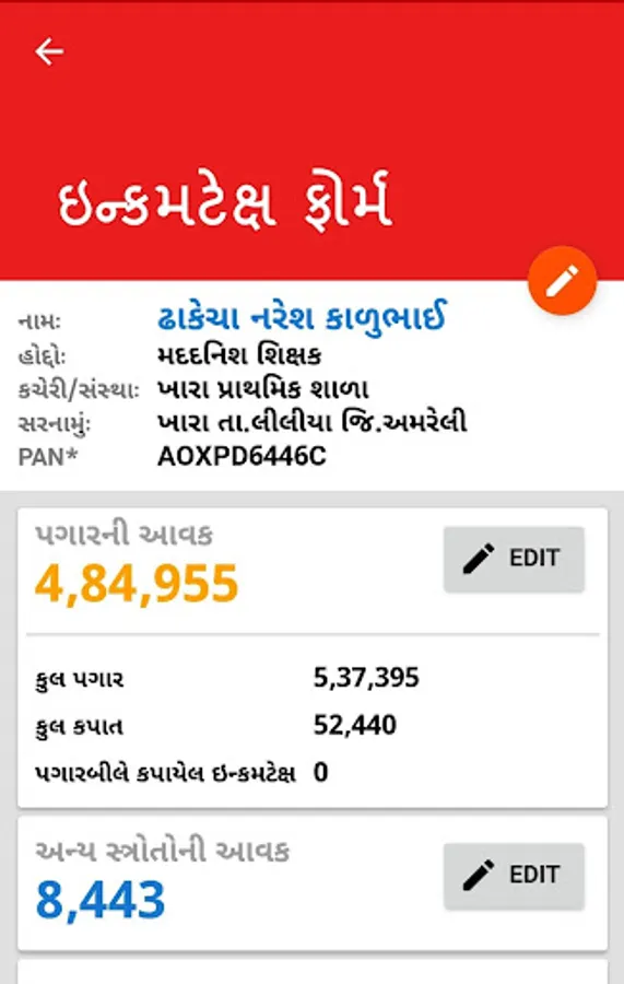 This app is providing income tax calculator and forms to government employees working in Gujarat. It is very easy to use. Users will find all guidance about tax acts and usage of app functions. You have to enter figures of salaries, other incomes and deductible amounts. All the calculations are displayed in the app. There are options for export forms - Gujarati form, Form - 16 and Salary Statement as Excel file.