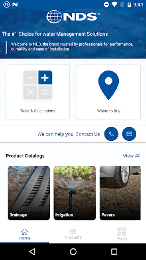 This app provides calculator tools, where to buy and contact us information. Download to get updates as new versions will include product details, links to installation videos and other tools to help with diagnosis and installation. As the leader in stormwater management solutions, NDS is the single source solution for all water management applications. NDS manufacturers high quality and durable stormwater management and efficient irrigation products that are sold all across the US. Since 1972, NDS has been installed by professionals on residential and commercial projects in a variety of applications.