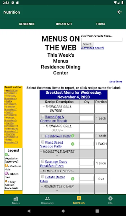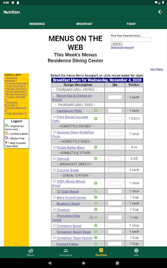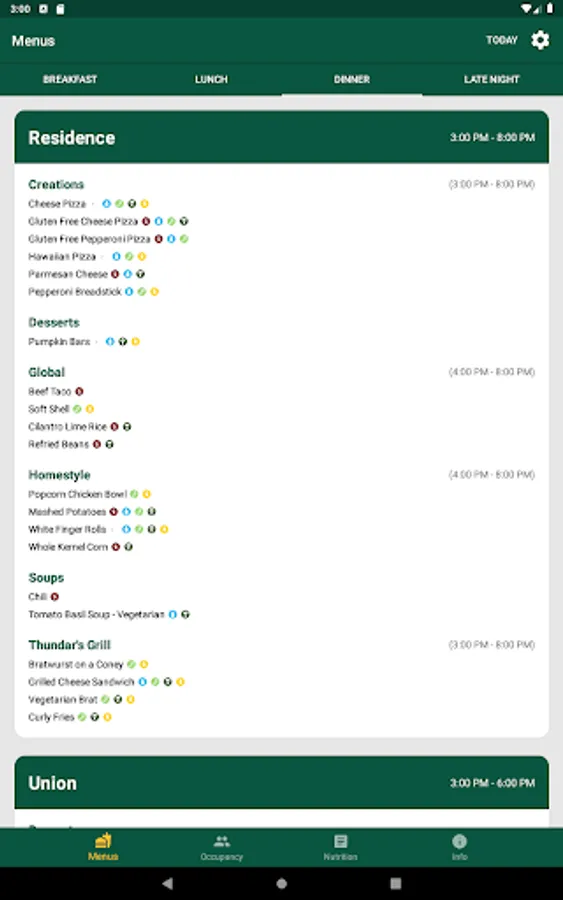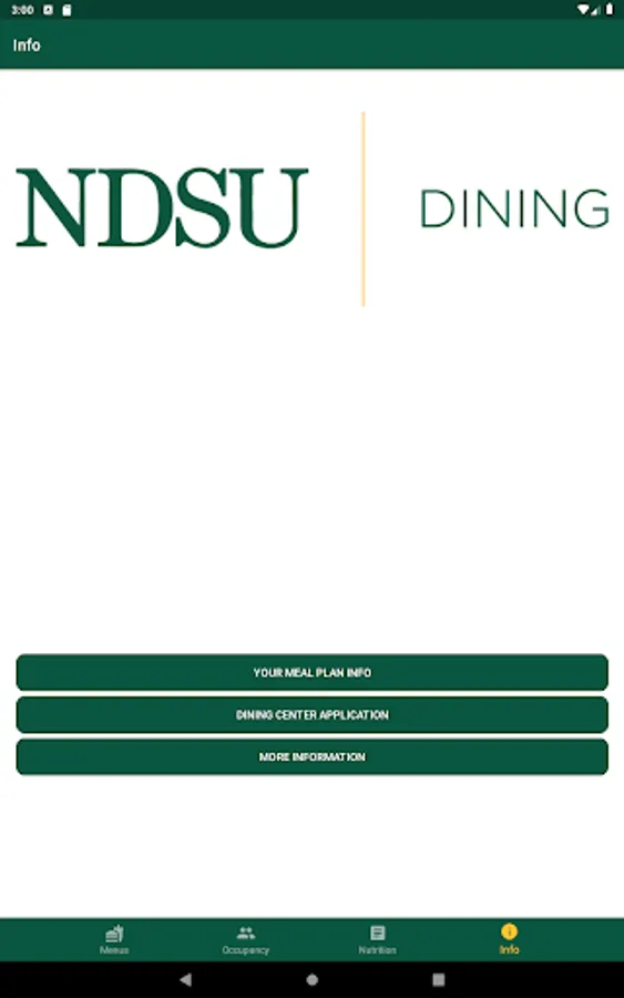 View breakfast, lunch, and dinner menus from West, Residence, and Union dining centers at North Dakota State University. You can also view nutrition information as well as allergy information. As well as viewing menus, you can also view hours of operation and serving times.
