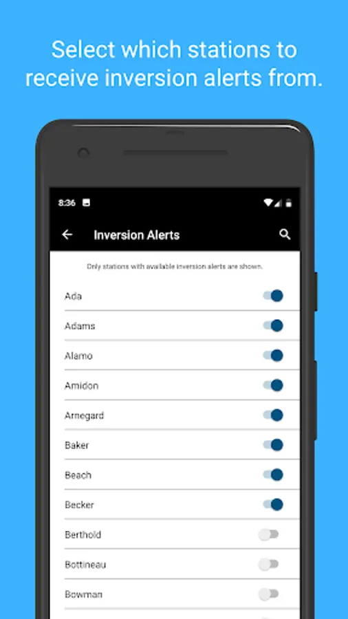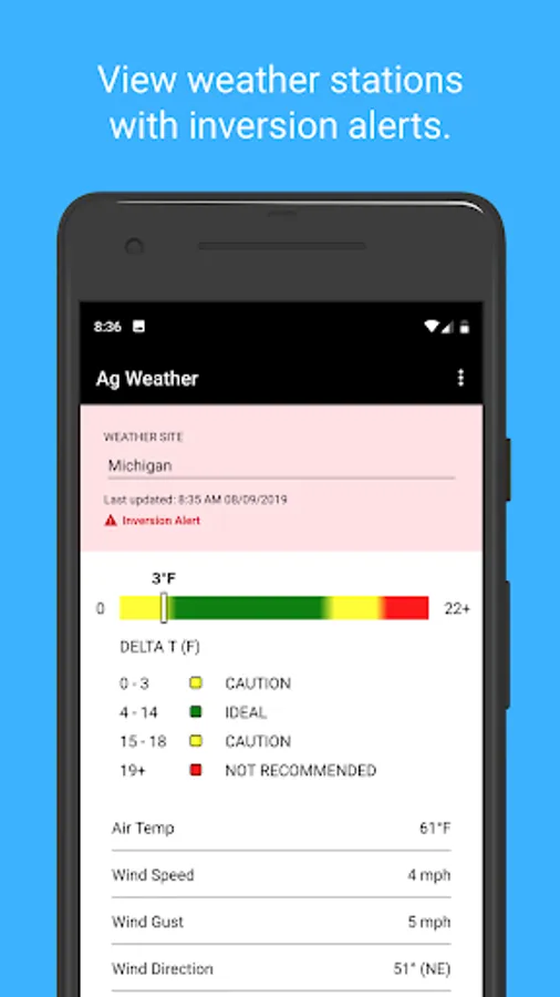 Real-time weather data from the North Dakota Agricultural Weather Network (NDAWN) is used to detect low-level air temperature inversions. An air temperature inversion occurs when the air temperatures near the ground are colder than the air above. The cooler and therefore, denser air, may make spray particles drift off target, often referenced as spray drift. Because spraying during an air temperature inversion is in violation of label instructions, this app, once an inversion is detected, sends a push notification to the user informing them that spraying may longer be advisable. These inversion alerts are resent occasionally until the inversion is no longer present for the station selected. Besides inversion alerts, weather data, including wind speed and temperature data which is also critical information while spraying is available. All NDAWN stations update current weather conditions every 5 minutes.
