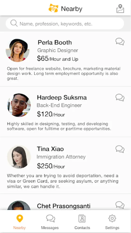 Nearal allow you to list your profession, and put your hourly rate, you can simply make an announcement of what you are offering or what you are looking for. You are browsing or searching professionals nearby; you can easily reach out to the professionals you’d like to contact and start to communicate; you can share text, images, locational or contacts with others…