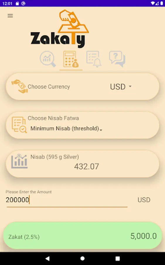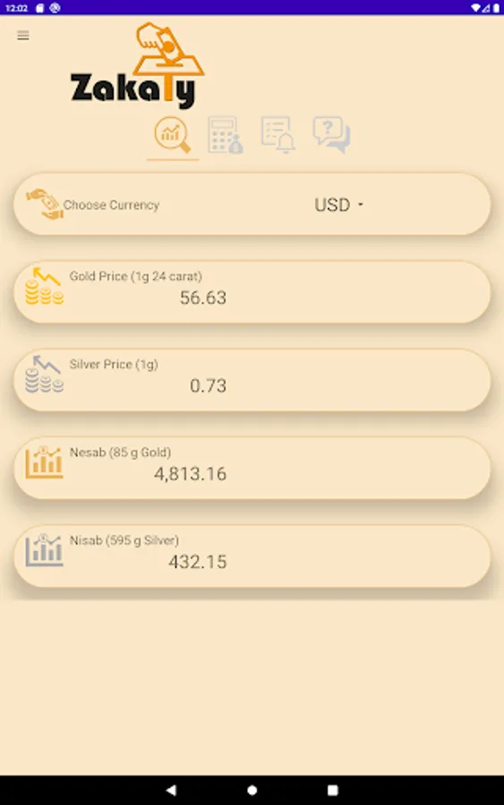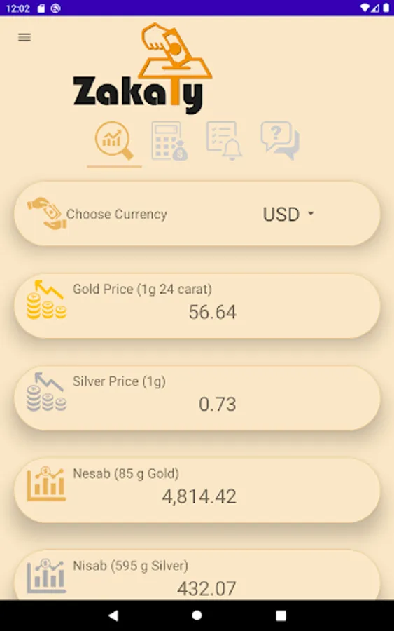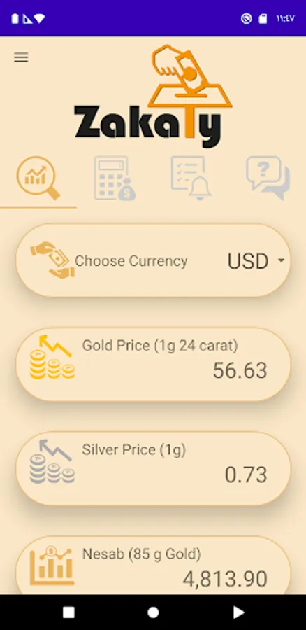 هذا التطبيق يساعدك على تتبع قيمة الذهب والفضة و حساب النصاب حسب الفتوة اللتي تتبعها وبعدها يقوم بمساعدتك بمتابعة الزكاة و التواريخ بحفظها والعودة لها لاحقا.