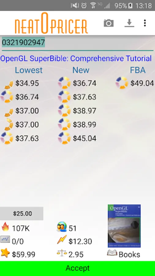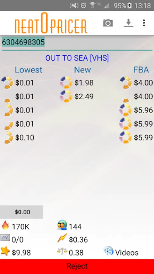 Neatopricer is a tool for professional online sellers that provides lightning fast Amazon price comparison. It uses our continually updated offline database with over 18 million items from Amazon.com. This means you can continue to scan even while offline and in areas with a poor internet connection. Alternatively, items can be found using on the fly live lookup if you don't mind waiting a few seconds.