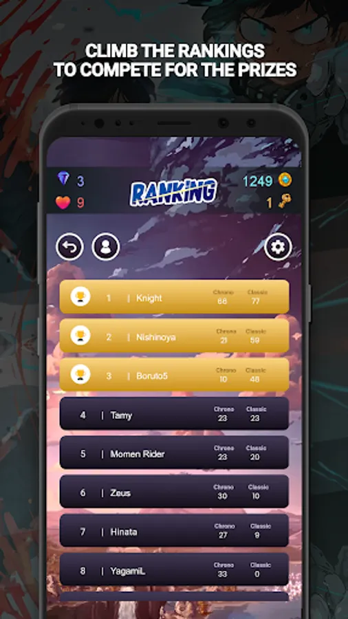 Give your brain a workout by figuring out the answers while keeping your resources consumption at a minimum. Beat your records and complete many challenging missions throughout the journey. Check the scoreboard to compare your ranking with fellow otakus around the globe. Challenge your friends to further enjoy this amazing anime games!
